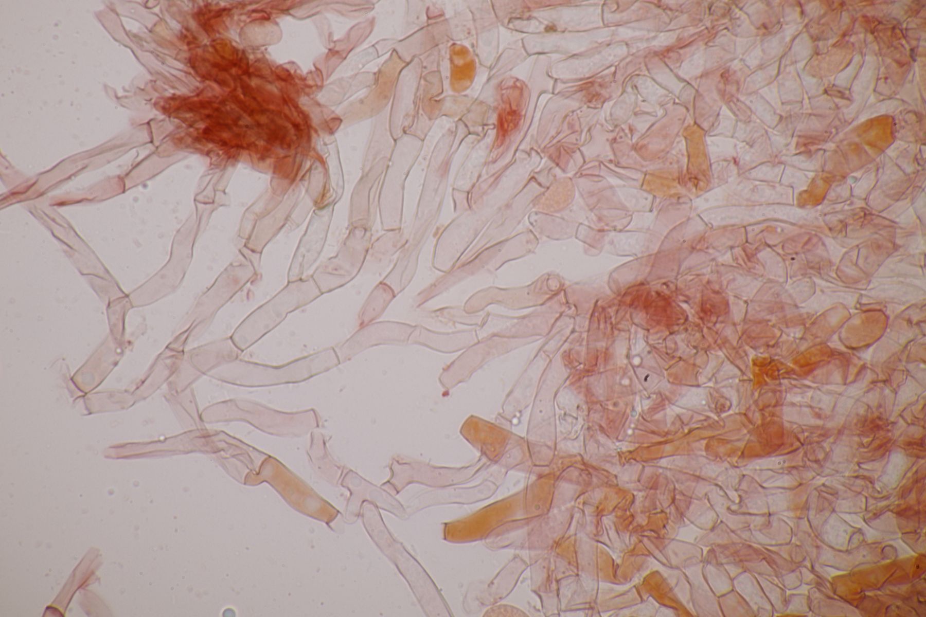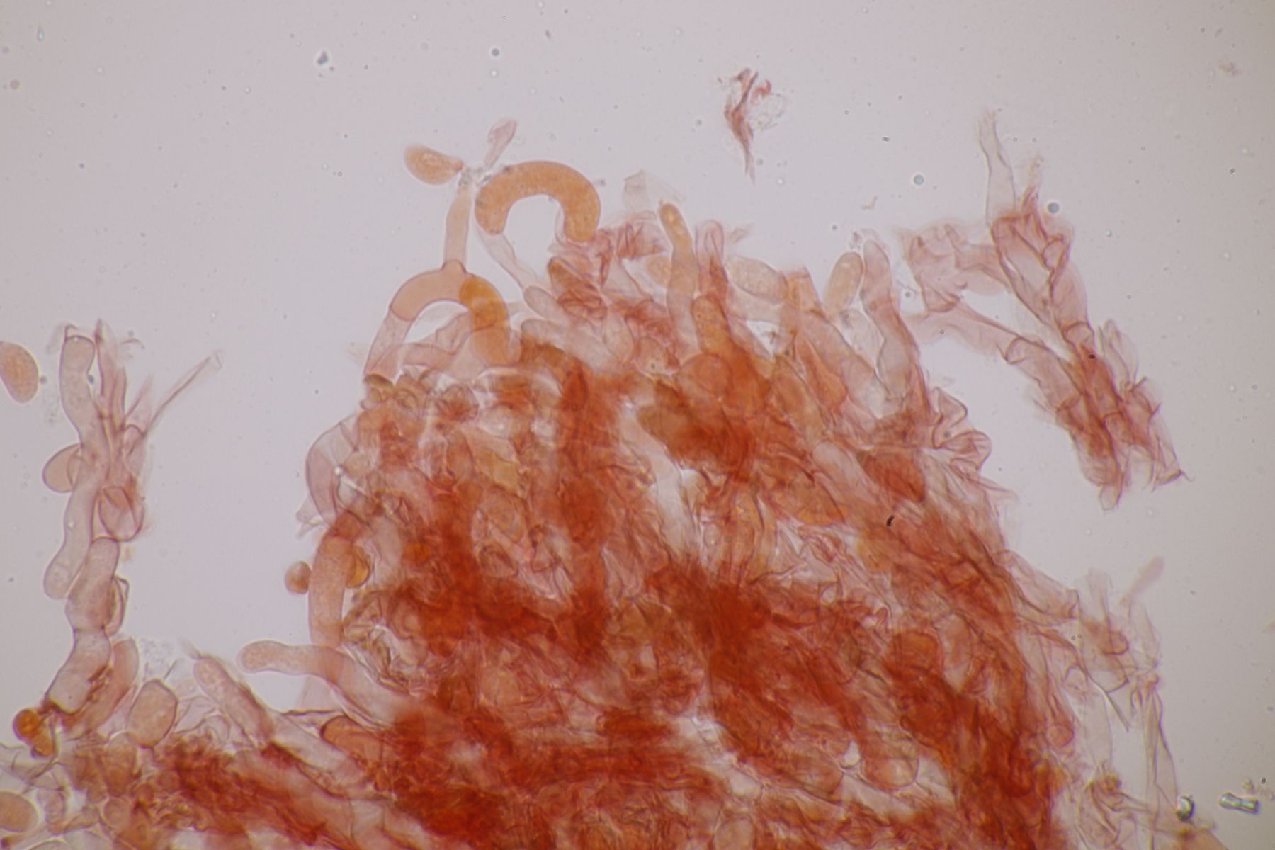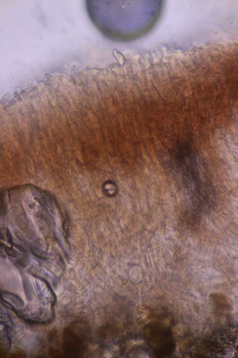 Hymenium: höckerig, glatte Oberfläche fein weißlich bestäubt, bei Berührung nachdunkelnd