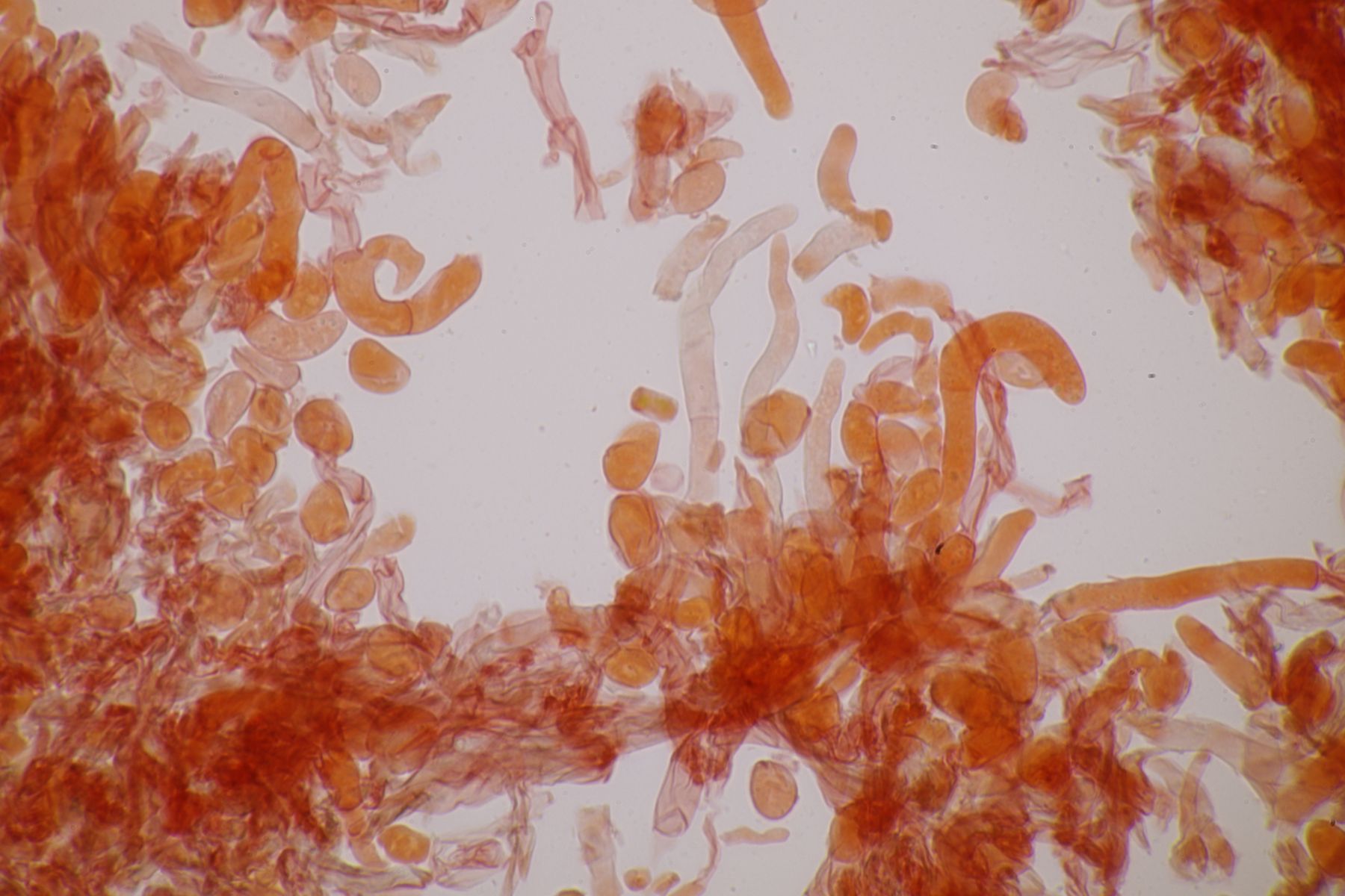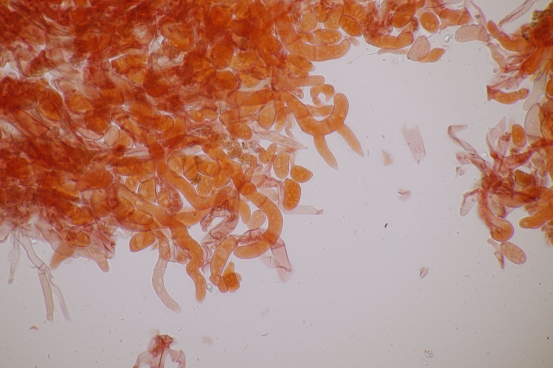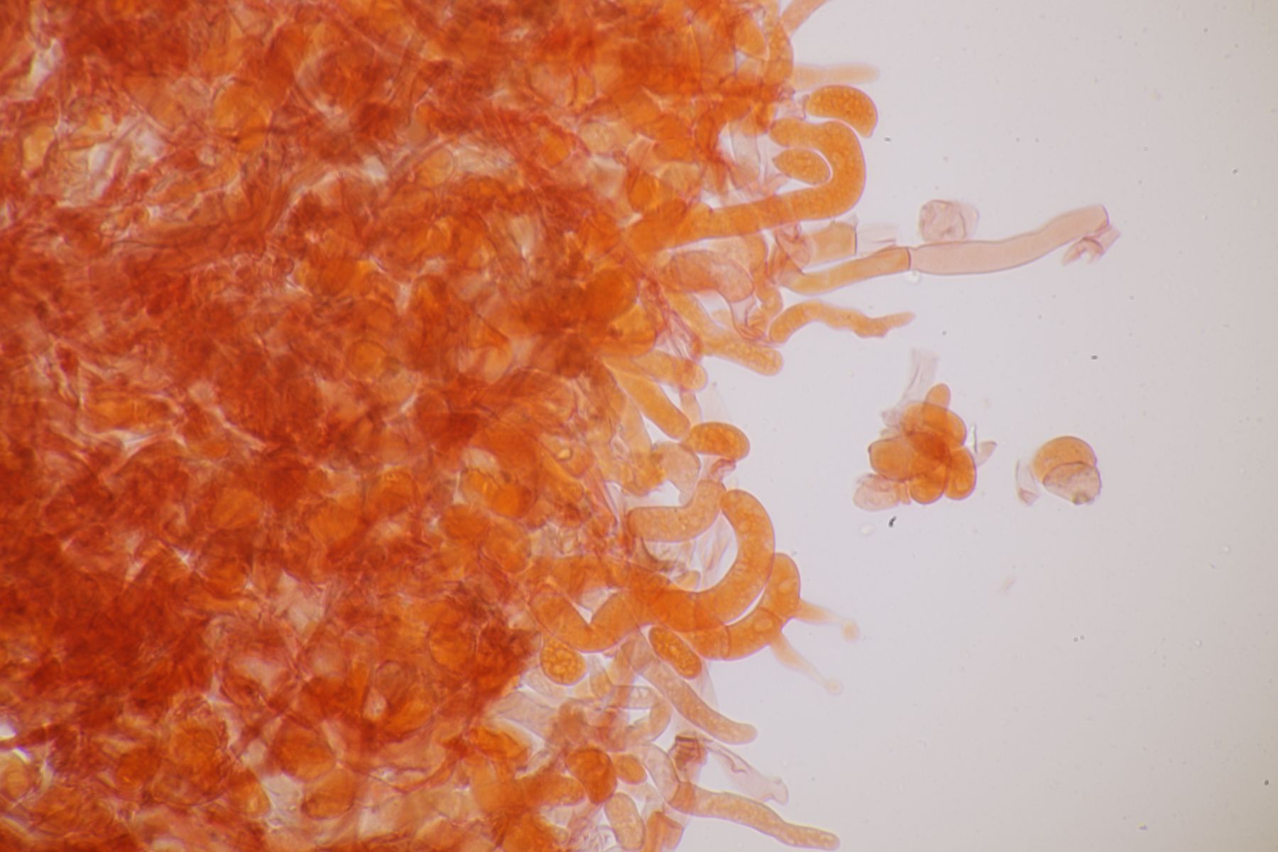 Hymenium: höckerig, glatte Oberfläche fein weißlich bestäubt, bei Berührung nachdunkelnd