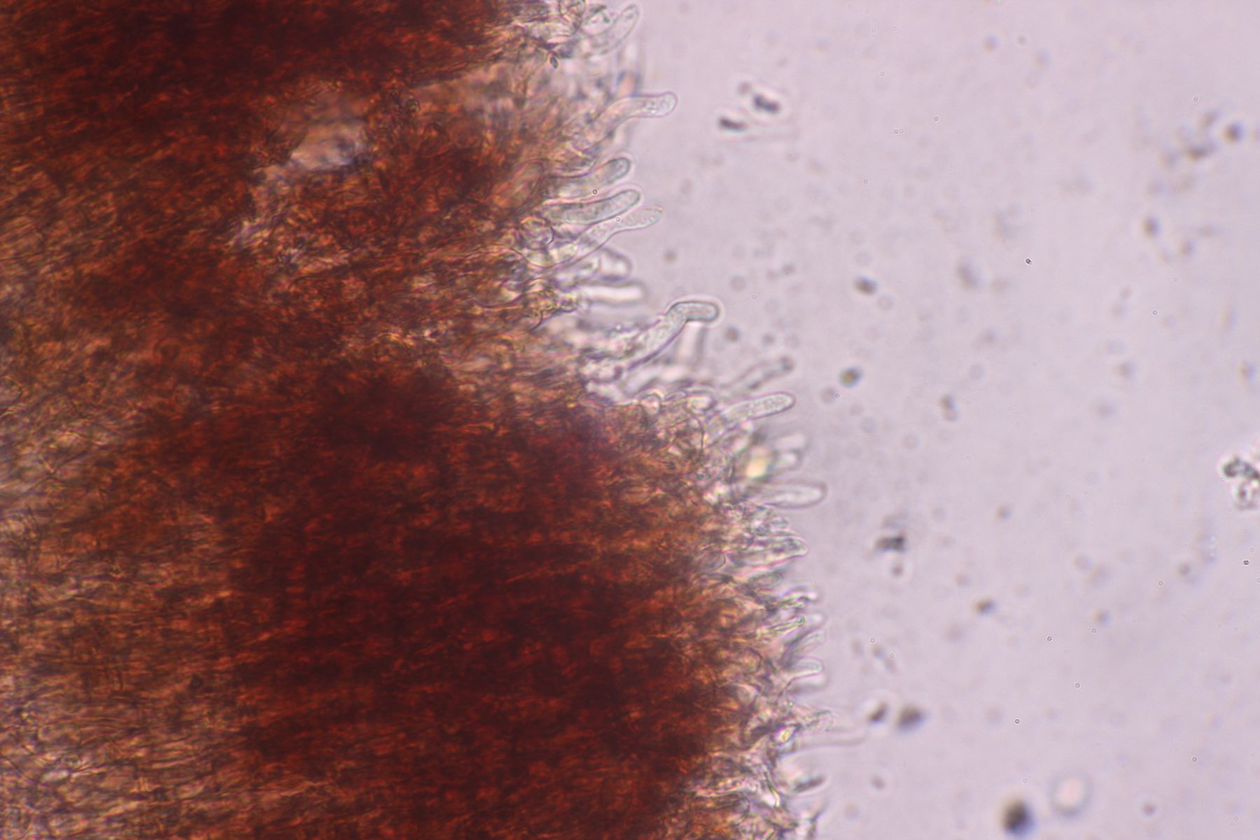 Fruchtkörper: Resupinat, dunkel blau-violett bis fast schwarz, zum Rand rötlich, am äußersten Rand weißlich