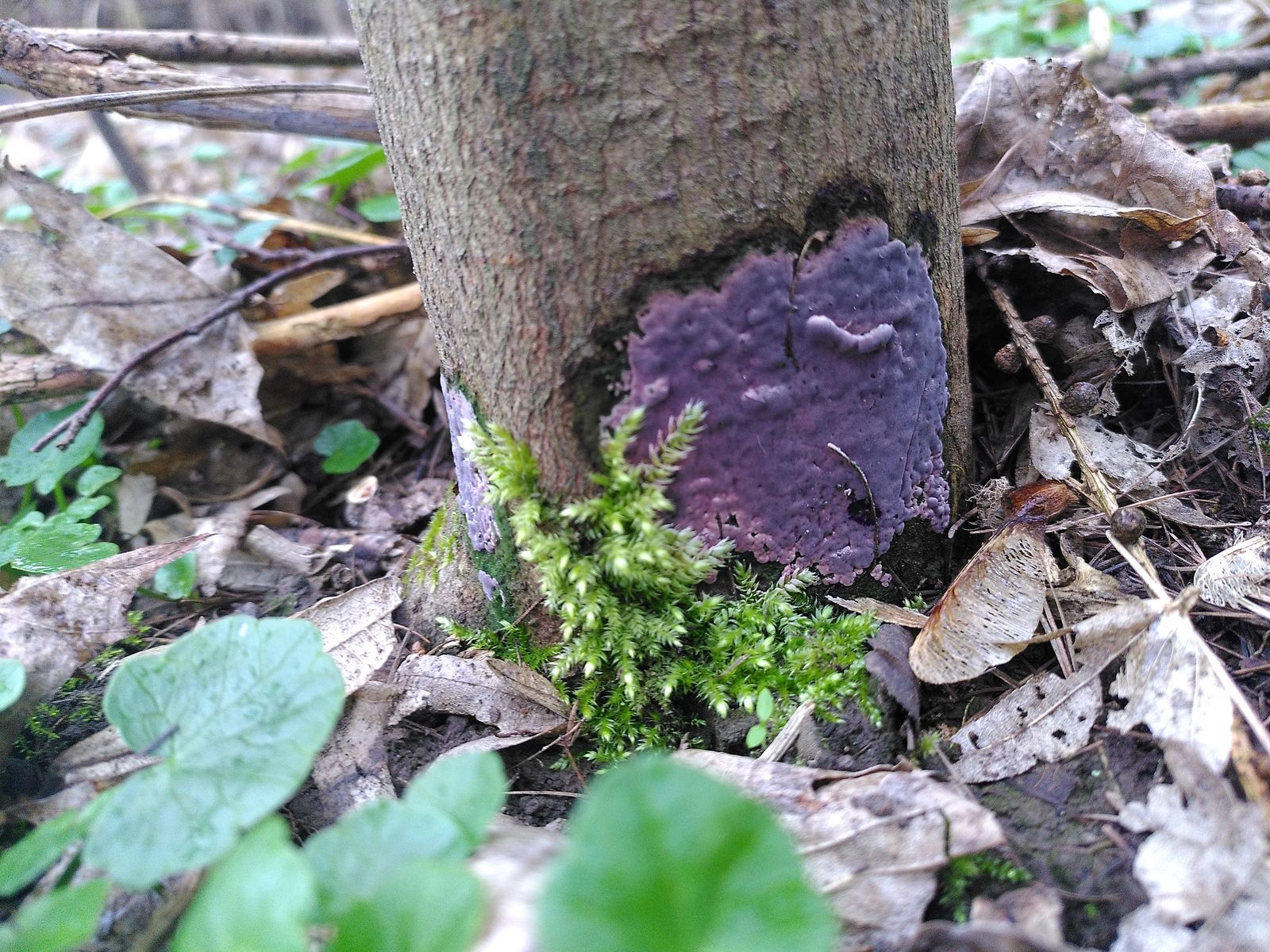 EDIT: Meine beste Idee wäre noch der Violette Knorpelschichtpilz (Chondrostereum purpureum), aber eigentlich kenne ich den nicht so bestäubt und mit derart dunklen Farben.
