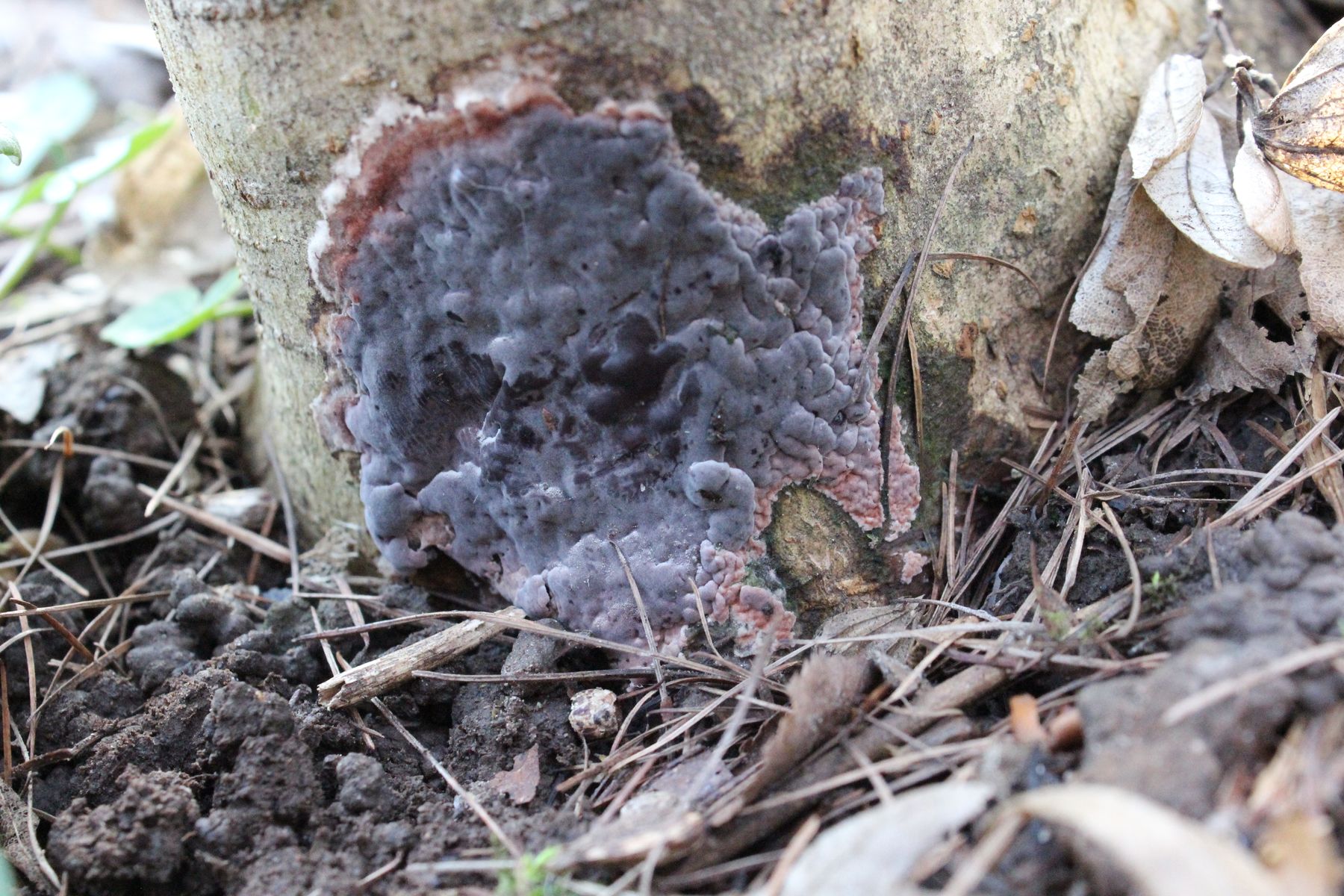 EDIT: Meine beste Idee wäre noch der Violette Knorpelschichtpilz (Chondrostereum purpureum), aber eigentlich kenne ich den nicht so bestäubt und mit derart dunklen Farben.