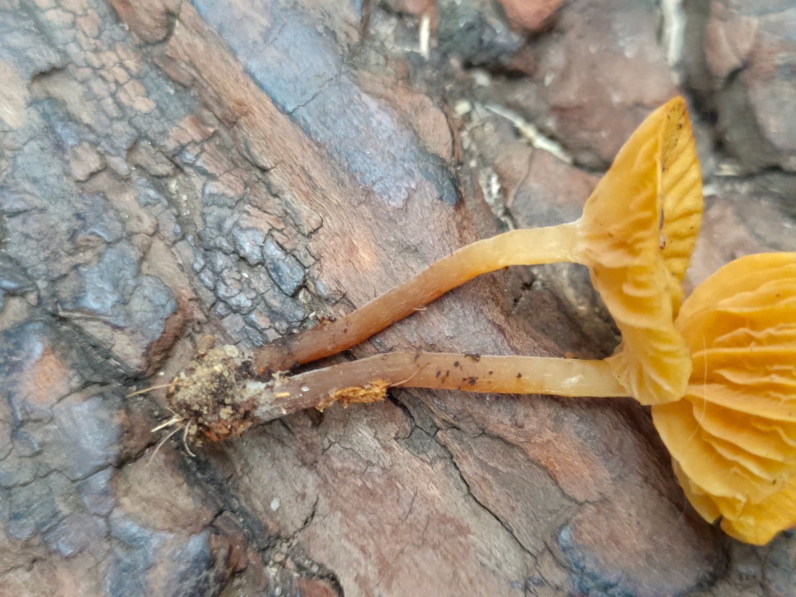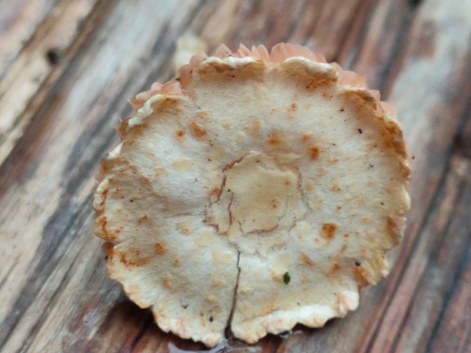 Edit: Die schnutzigen, fast freie Lamellen und die helleren Schneiden könnten zu einem Iocybe passen. Die Hutschuppung und die Randzone des beigen Hutes sind sehr aufällig. Ich tendiere zu einem Risspliz, der Geruch wird noch geprüft.