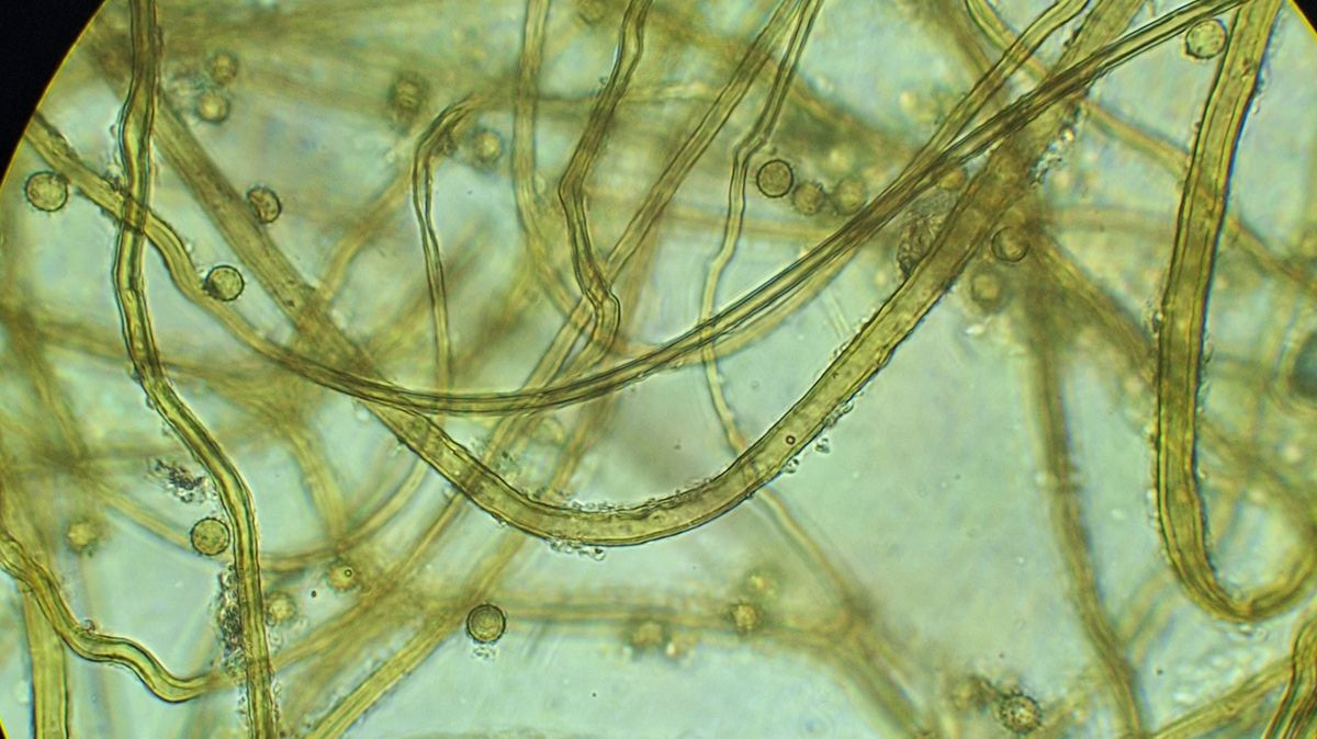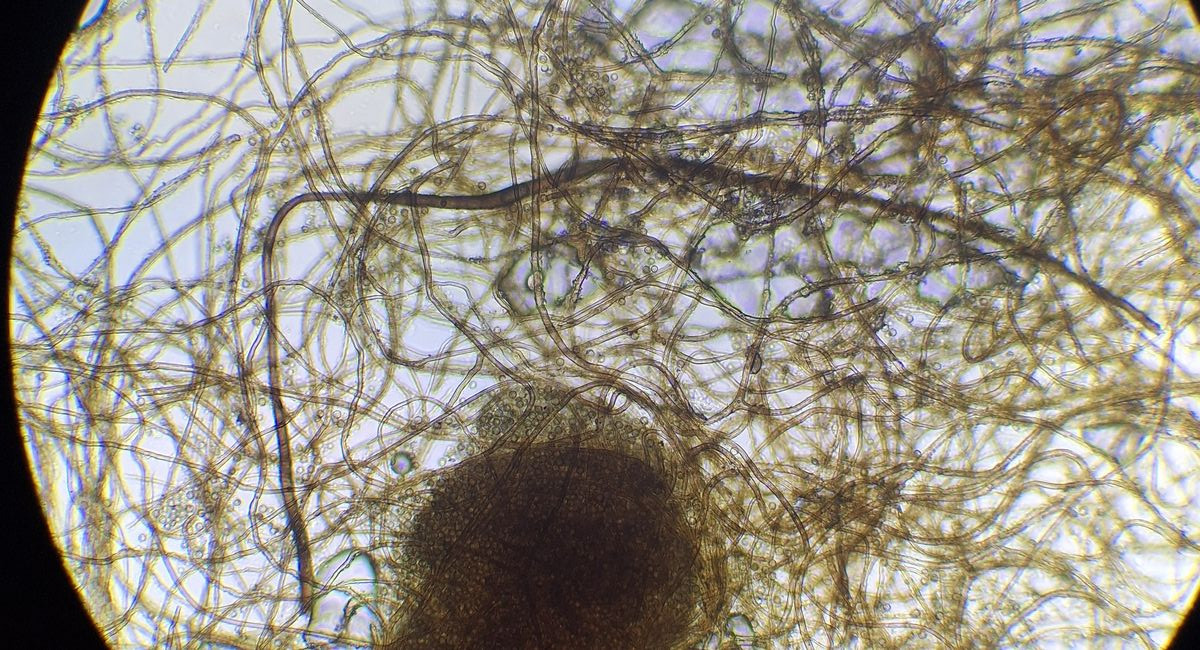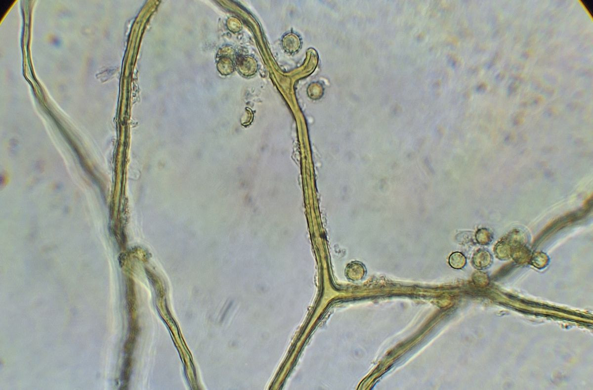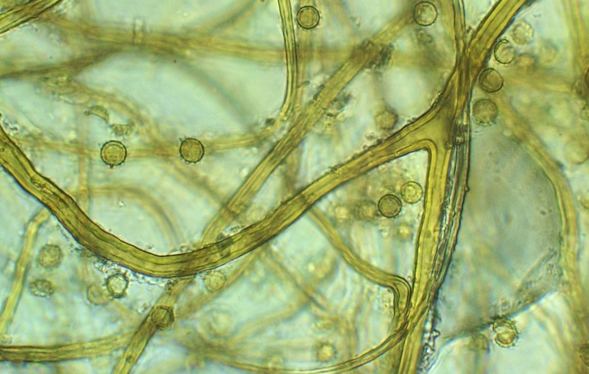 Die Sporen sind schon mit dem 40er als deutlich warzig zu erkennen, 4-6 µm groß. Capillita verzweigt, vereinzelt mit Blasen. Der eine dicke Strang ist bis zu 10 µm dick. Auffällig sind die Anlagerungen um die Capilita-Stränge, die bei den Zeichnungen von Hanna Maser nur bei umbrinum gezeigt werden, nicht jedoch bei foetidum - keine Ahnung ob das bestimmungsrelevant ist.