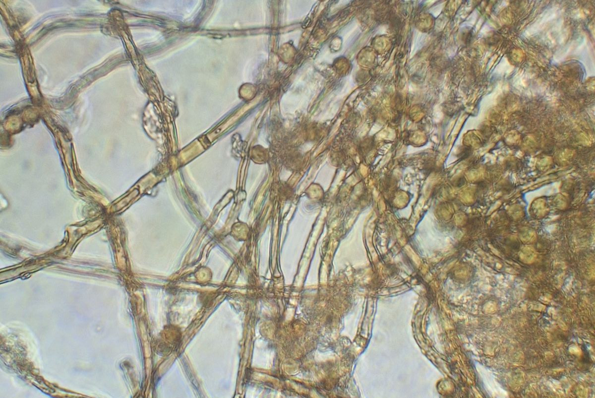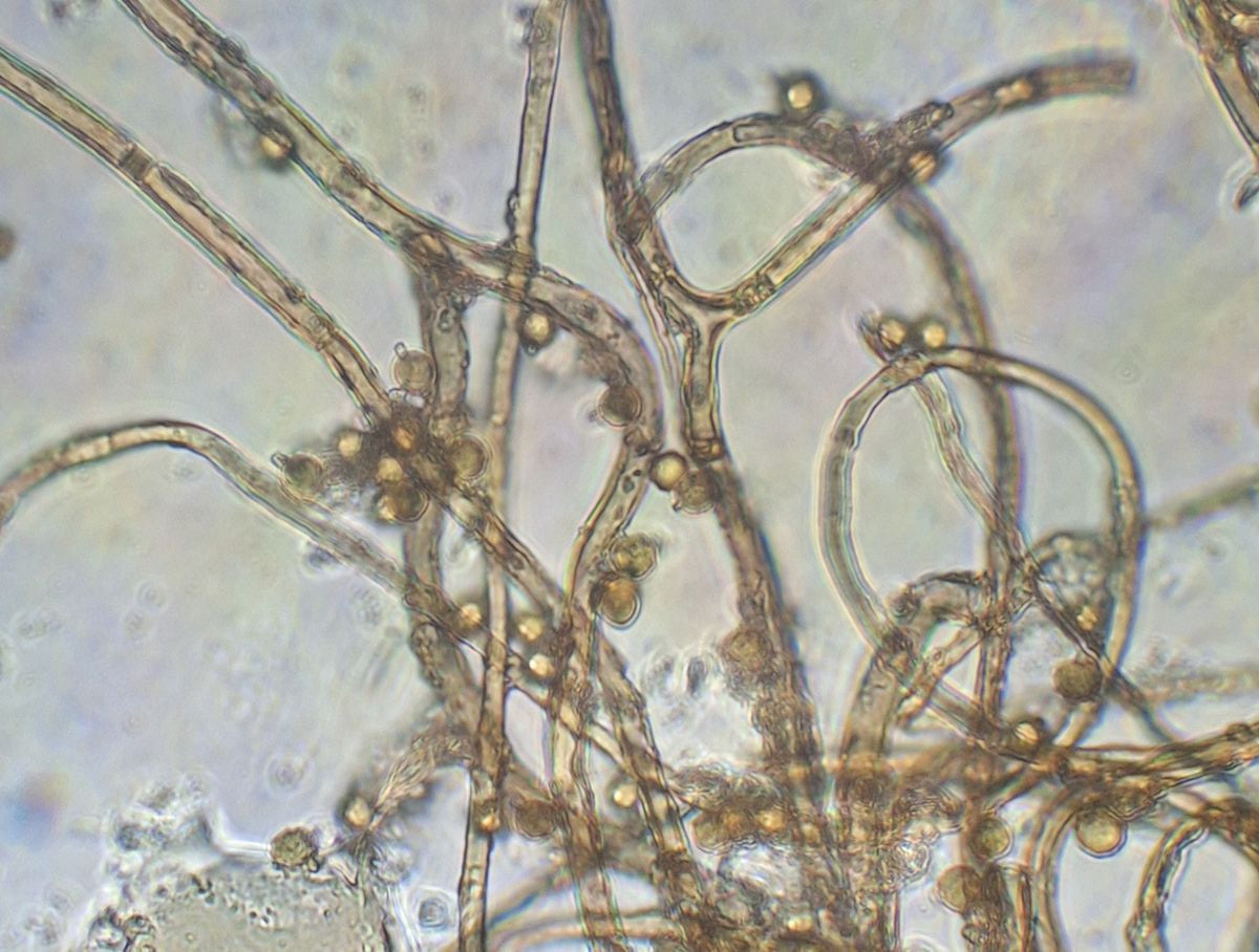 Die Sporen sind mit nicht vielen flachen Warzen besetzt, die in der Draufsicht etwas besser zu sehen sind.