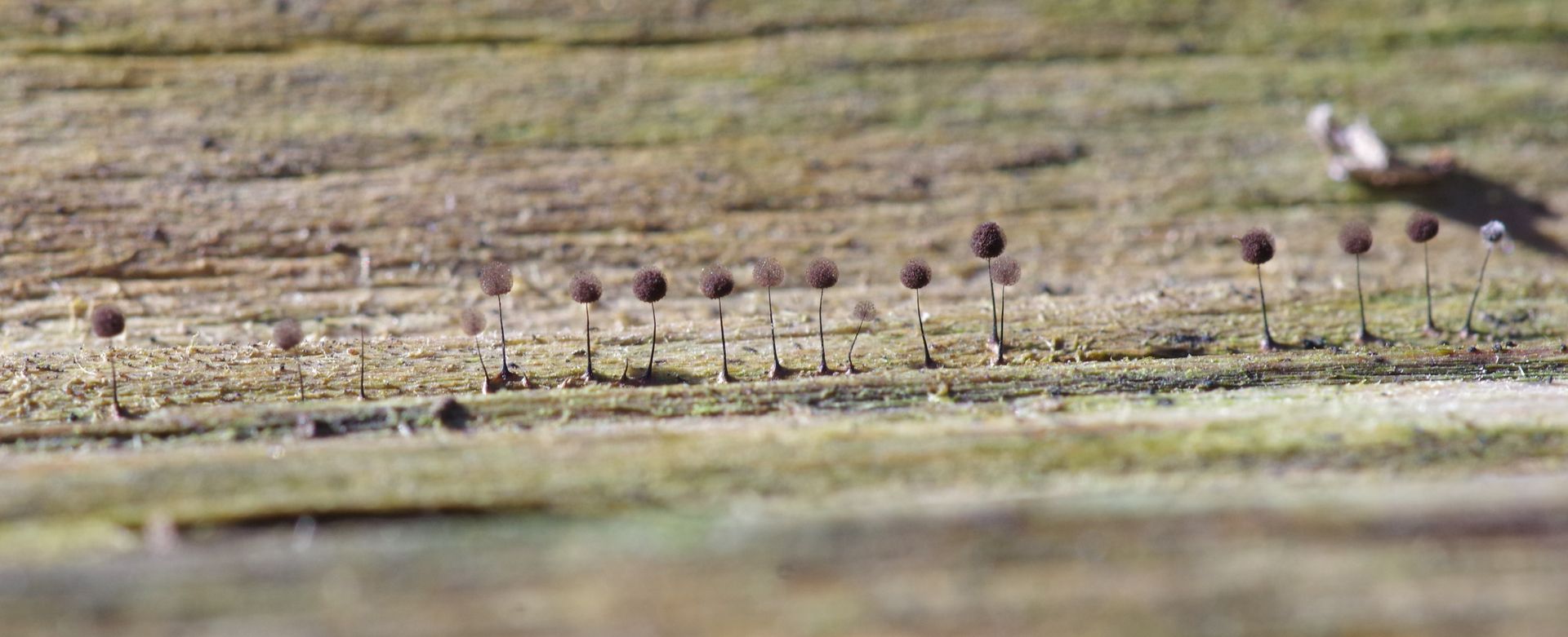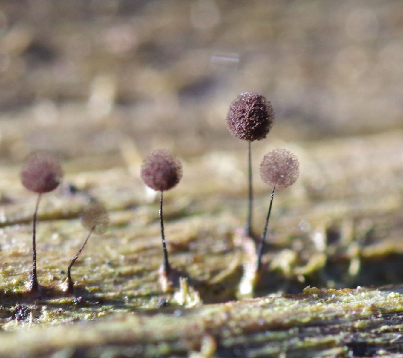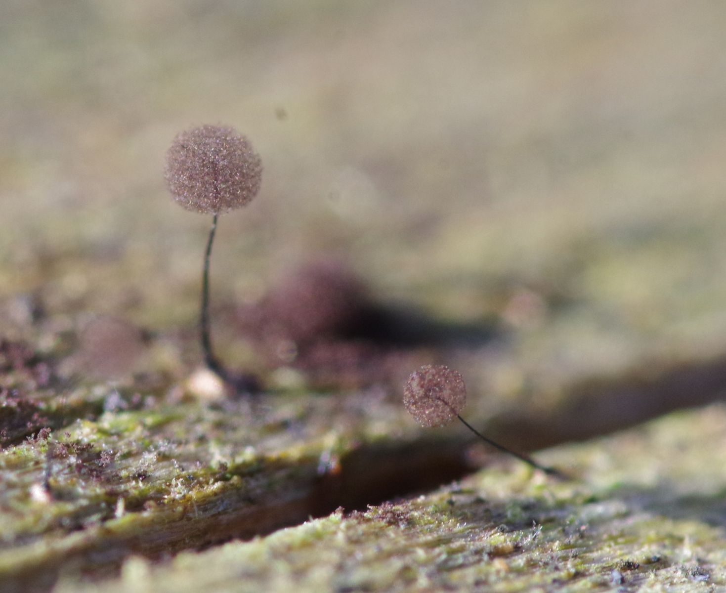 an toter, zersplitterter Kiefer, in der Luft hängend, wächst unterseits dieser bestielte Schleimi. Ich komme zur Gattung Lamproderma. Mein Schlüssel hat in der Gattung aber nur drei Arten, mit niedrigen einstelligen Funden, also sicher nicht vollständig. Alles von heute.