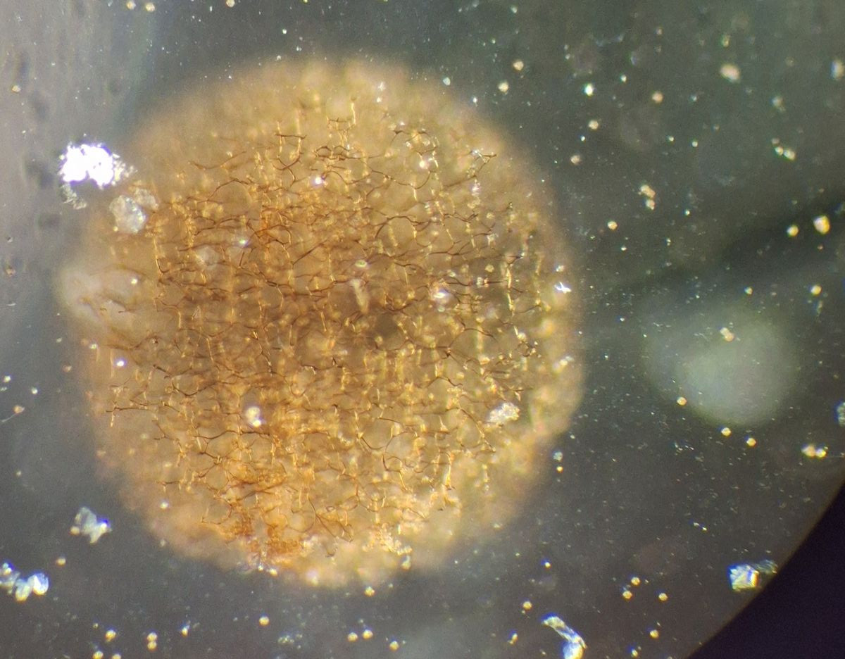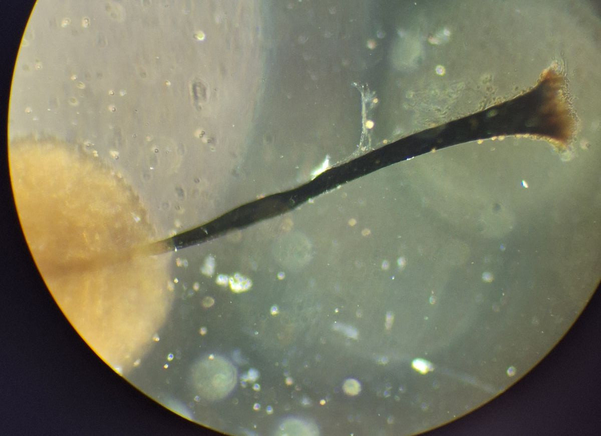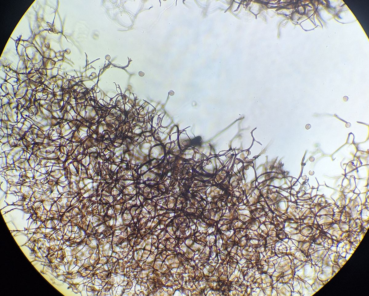 an toter, zersplitterter Kiefer, in der Luft hängend, wächst unterseits dieser bestielte Schleimi. Ich komme zur Gattung Lamproderma. Mein Schlüssel hat in der Gattung aber nur drei Arten, mit niedrigen einstelligen Funden, also sicher nicht vollständig. Alles von heute.