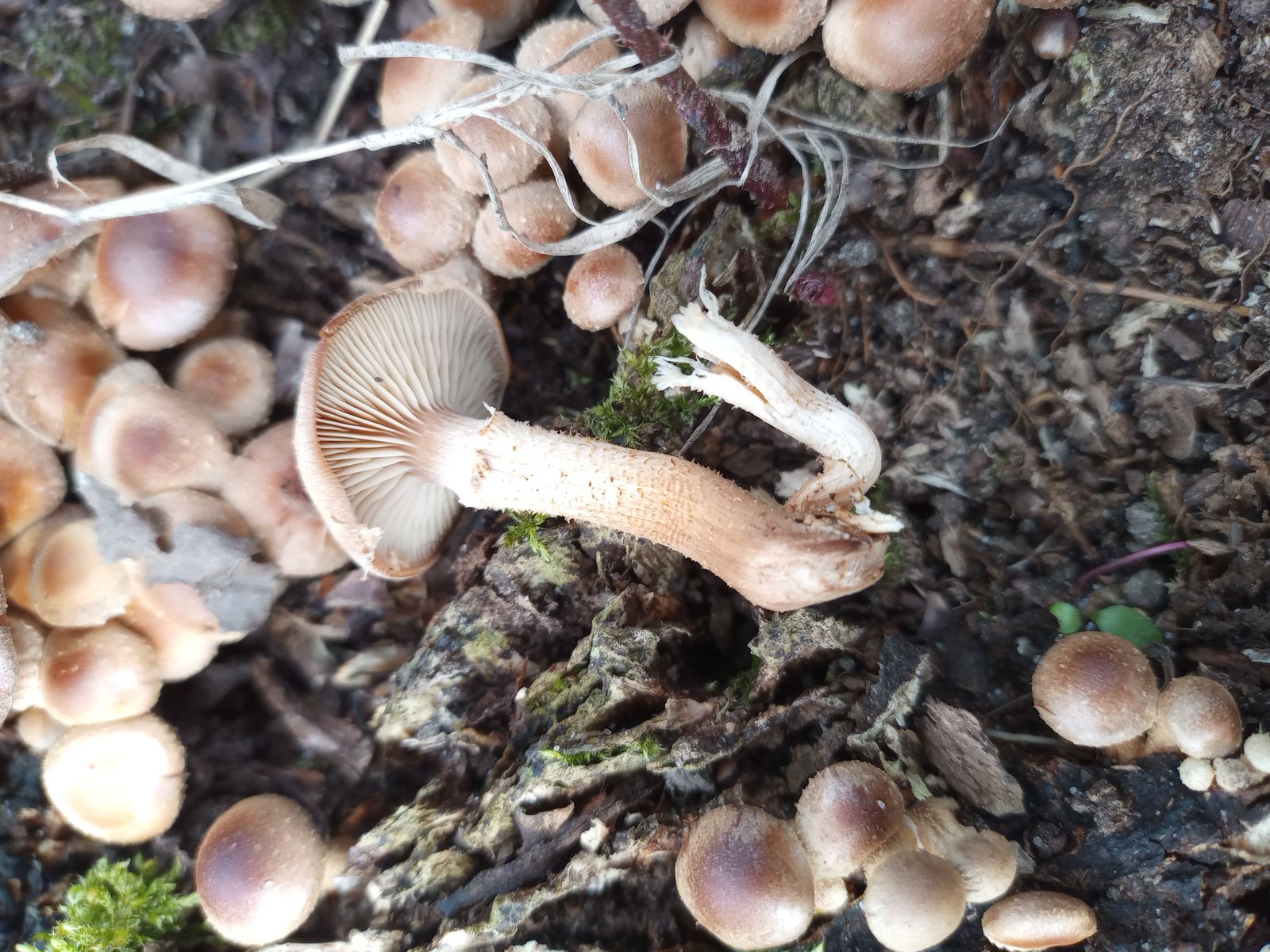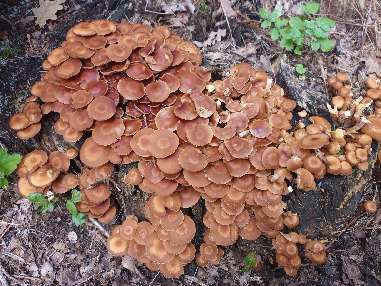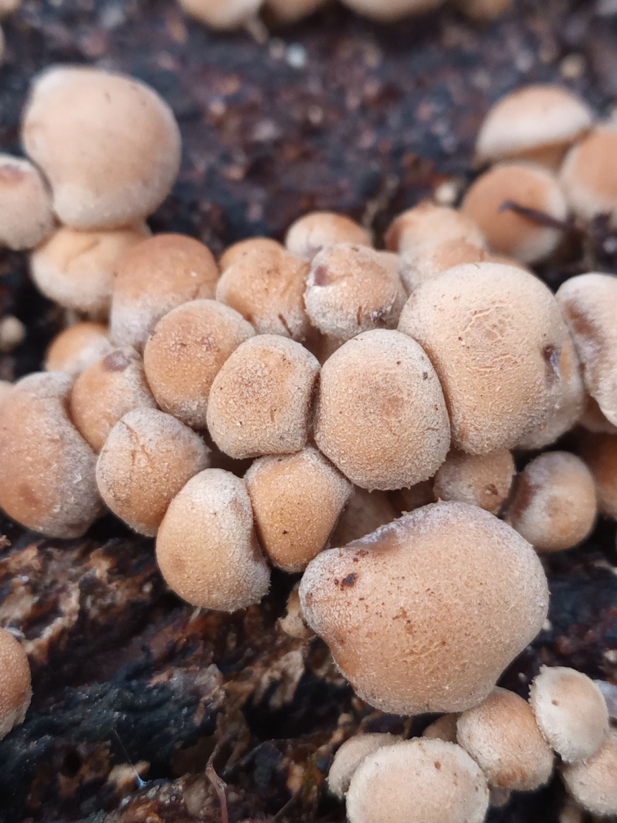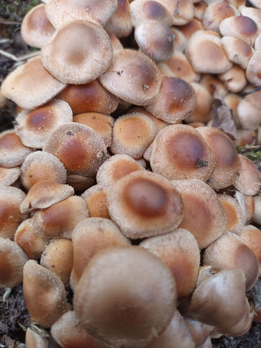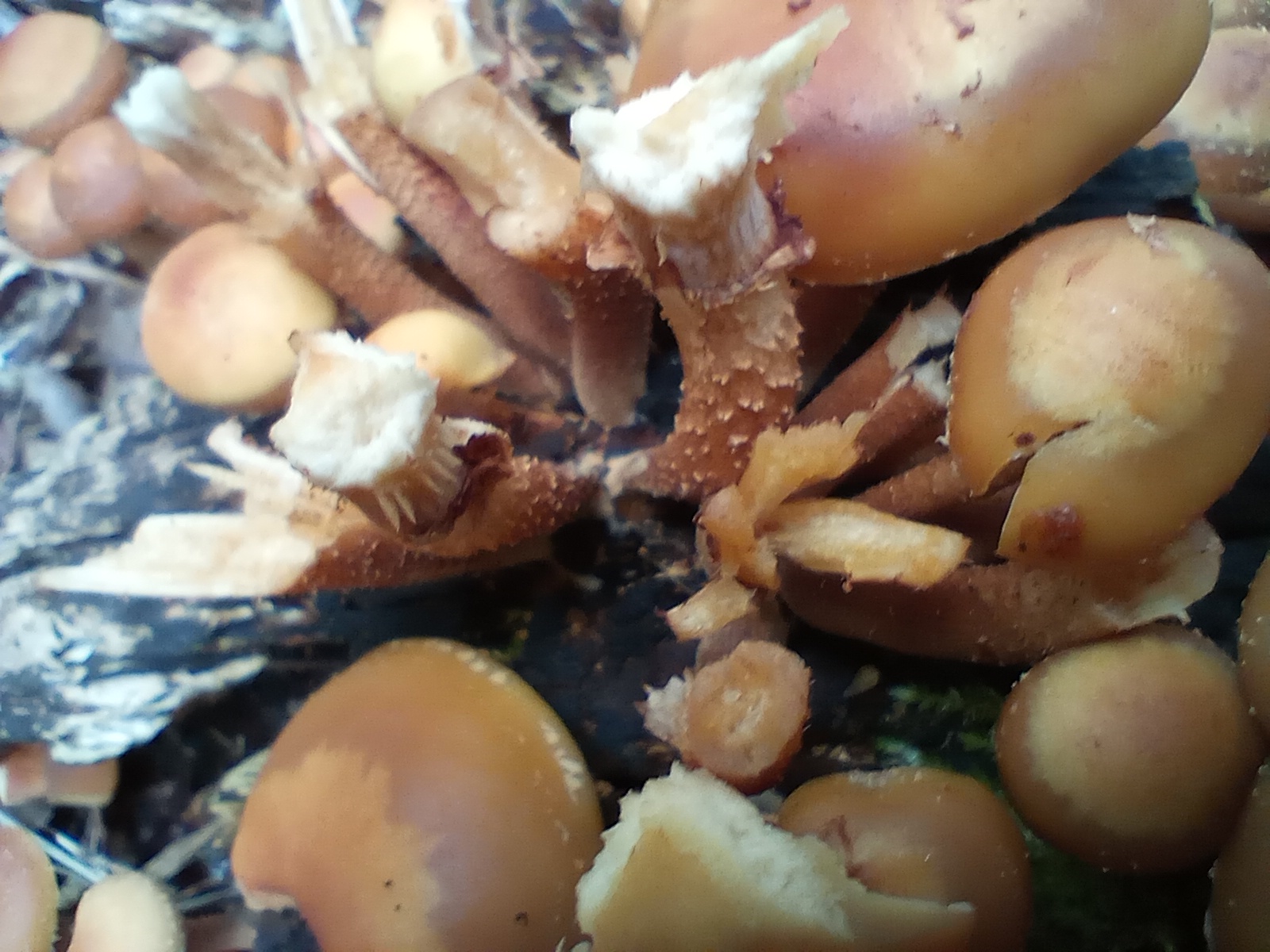 So, ich war heute nochmal da. Jetzt haben sie die typische Hautfarbe und auch den unverkennbaren "Stockschwämmchen-Geruch". Mein Smartphone hat ein leichtes Problem mit der Darstellung von Rot-Gelb-Tönen, deshalb mögen die immer noch falschfarbig erscheinen. Ich bin mir aber jetzt sicher, dass es sich um Stockschwämmmchen handelt.