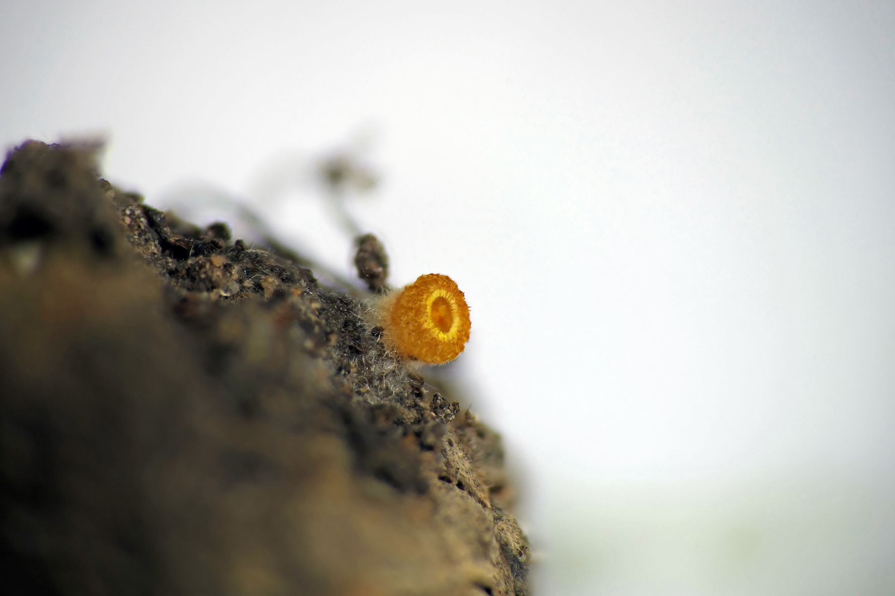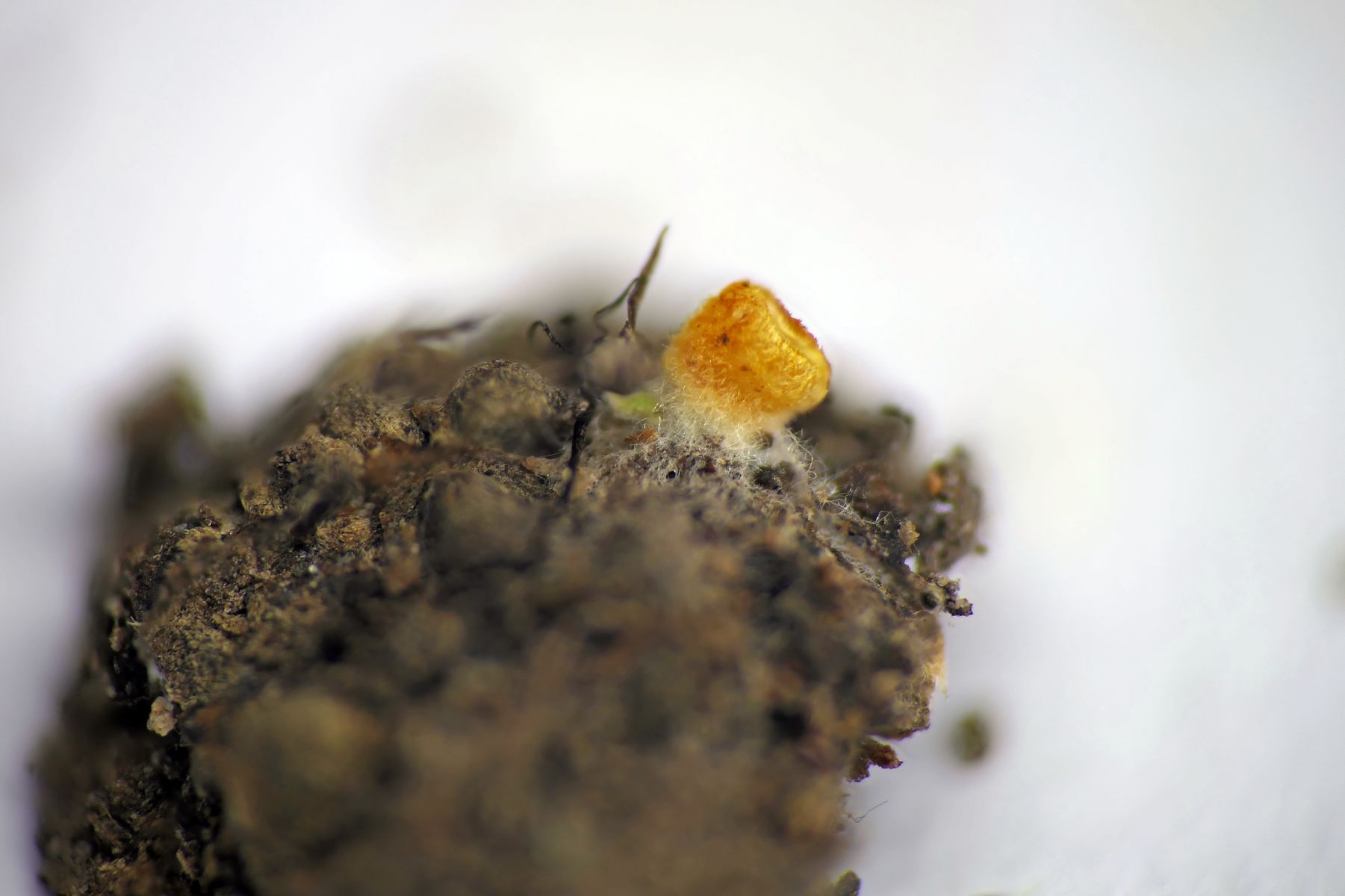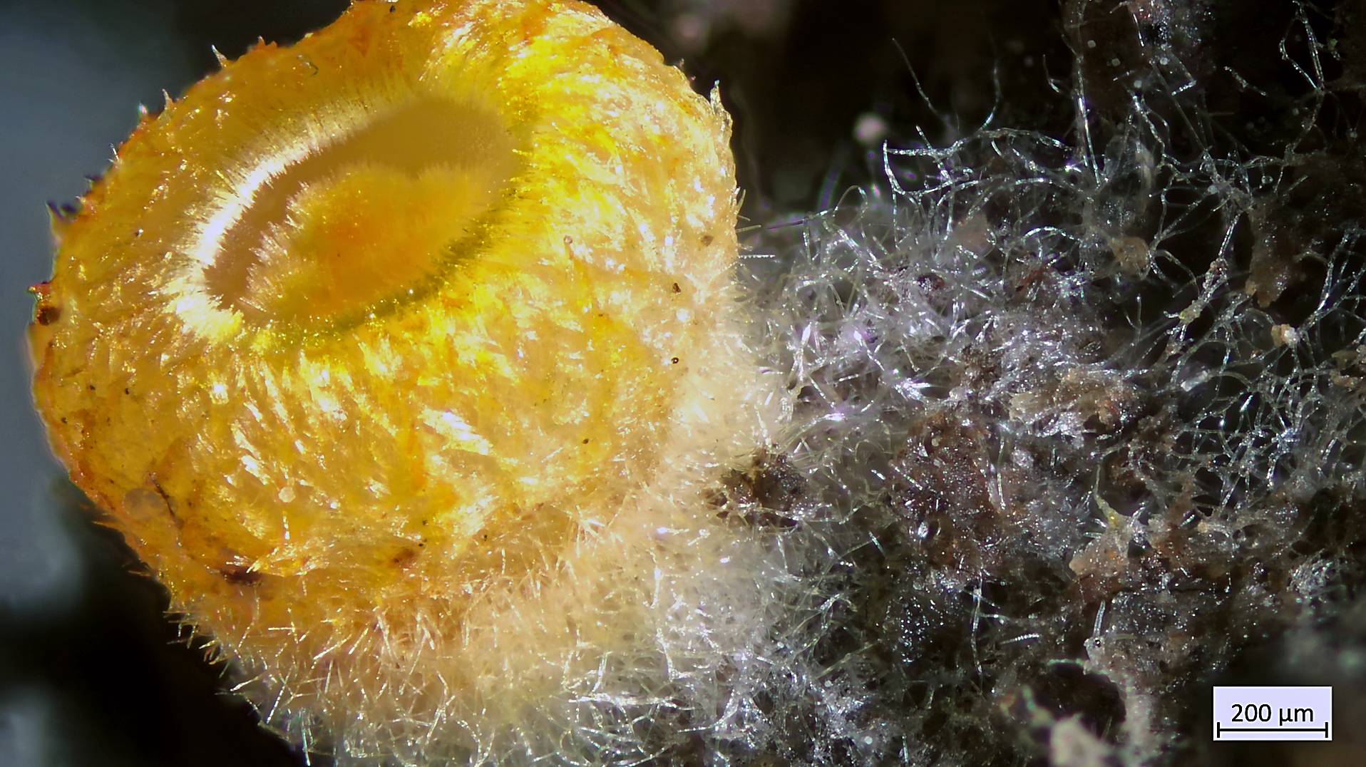 Arachnopeziza aurelia - Das goldgelbe Spinnwebbecherchen. Gefunden auf der Cupula mehrerer Eicheln (Eichenwald). In der Summe winzig (1-2mm). Häärchen aber mit bloßem Auge bereits zu erkennen.