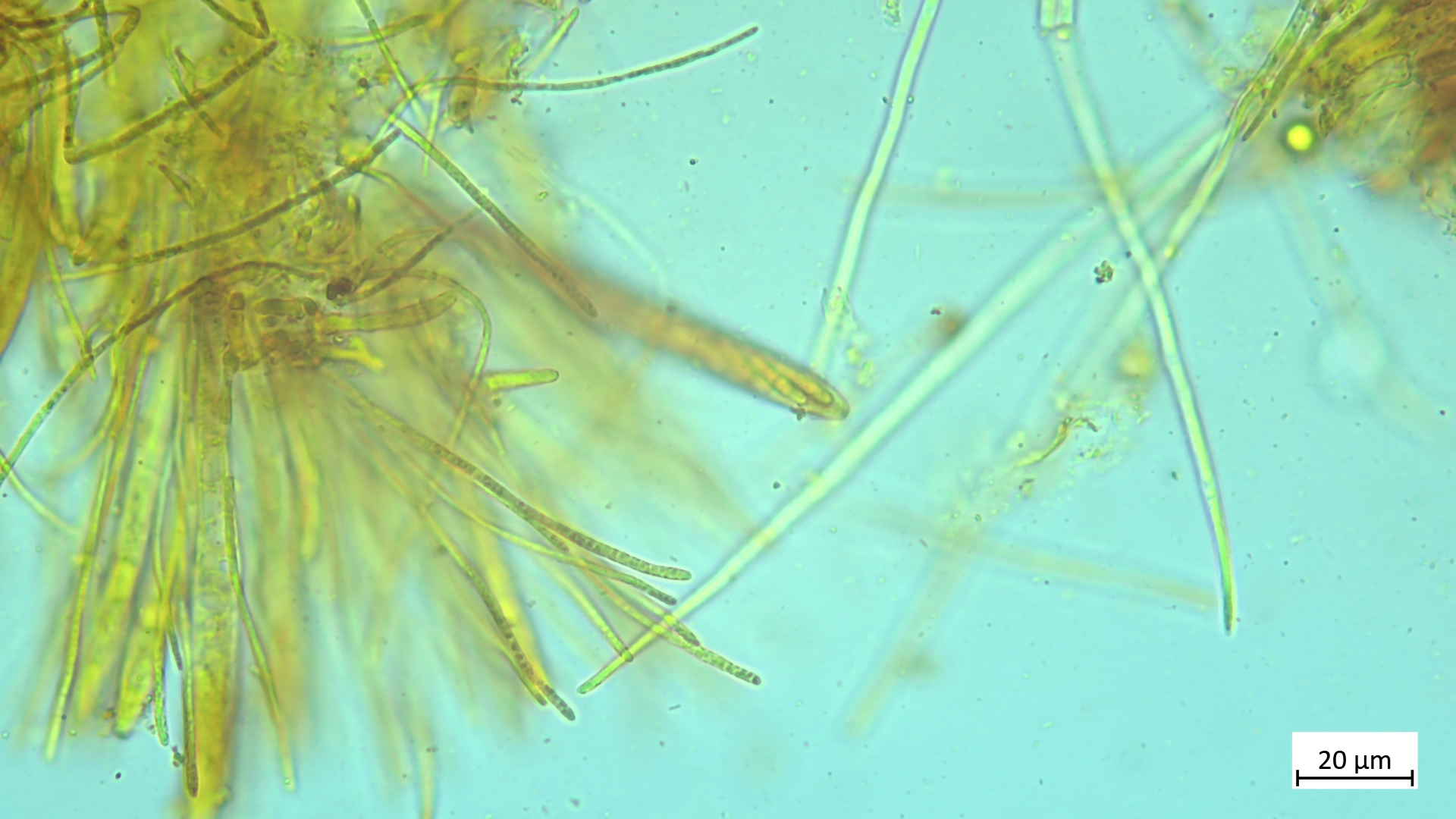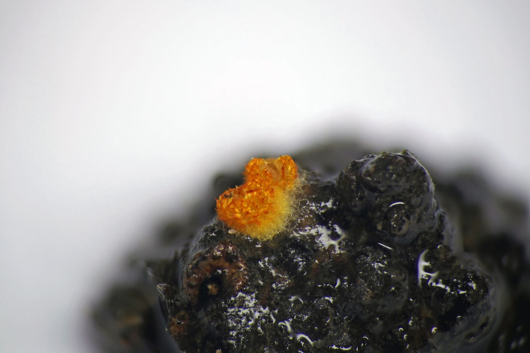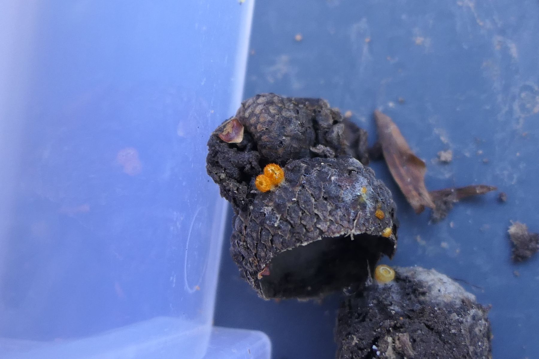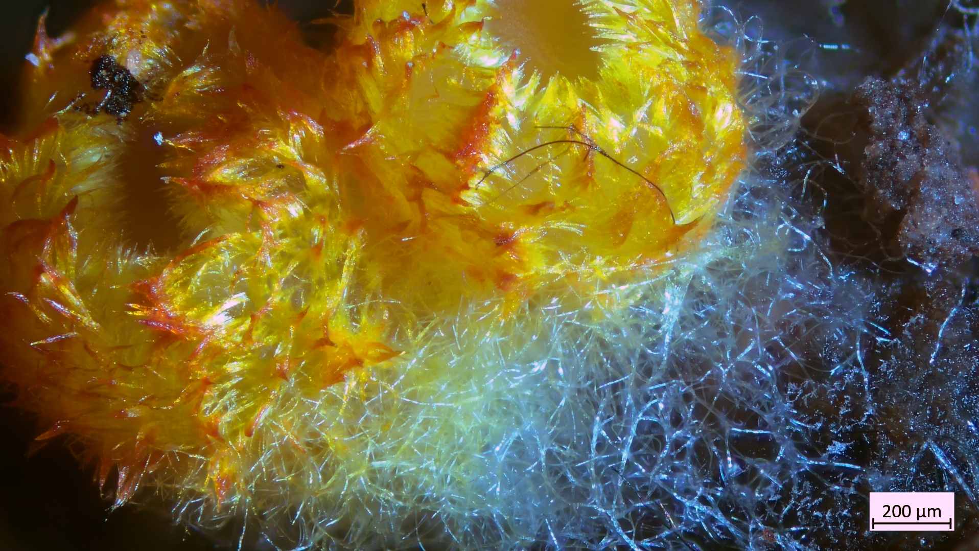 Arachnopeziza aurelia - Das goldgelbe Spinnwebbecherchen. Gefunden auf der Cupula mehrerer Eicheln (Eichenwald). In der Summe winzig (1-2mm). Häärchen aber mit bloßem Auge bereits zu erkennen.