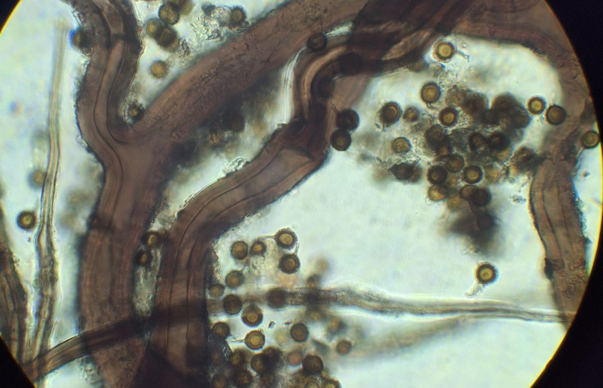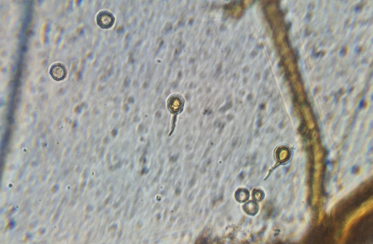 Sporen mit im Vergleich zu B. plumbea kürzeren Sterigmenresten, ~6 µm groß, feinwarzig oder rauhe Oberfläche