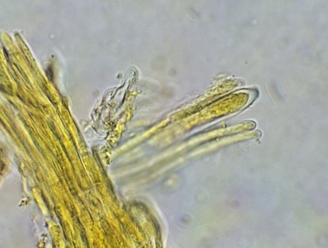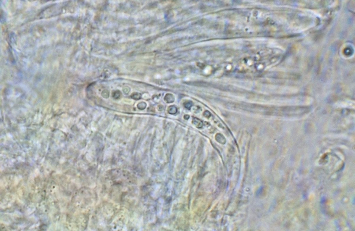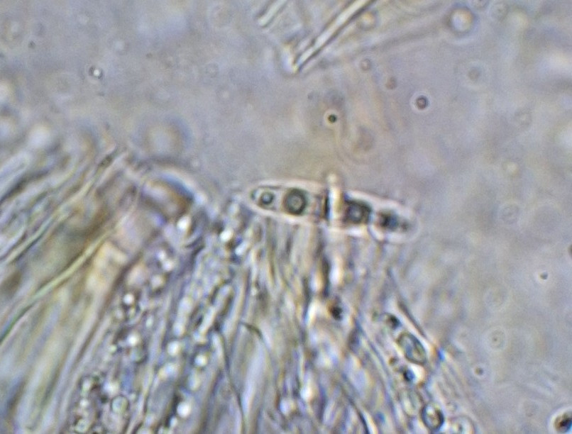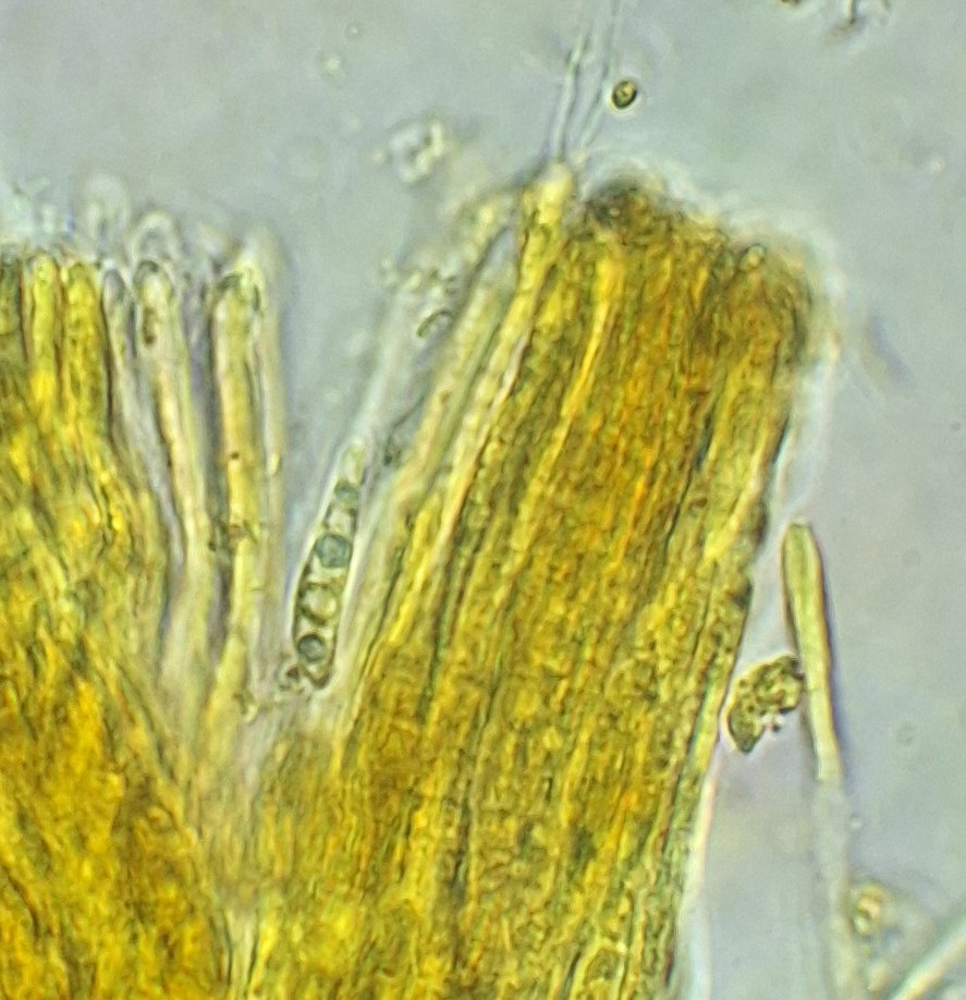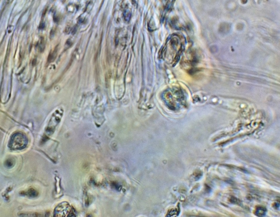 hier mein Versuch mit Jod (KJ in Alk) zu mikroskopieren. Wie nun allerdings jodpositiv bzw. jodnegativ auszusehen hat, habe ich nirgends gefunden. Da die Ascusspitzen sich nicht mit gelb verfärben, ist das aber wohl J-. Also nicht die vermutete M. coerulans. Das Substrat ist kein Wasserdost. Ich tendiere zu Arctium minus.