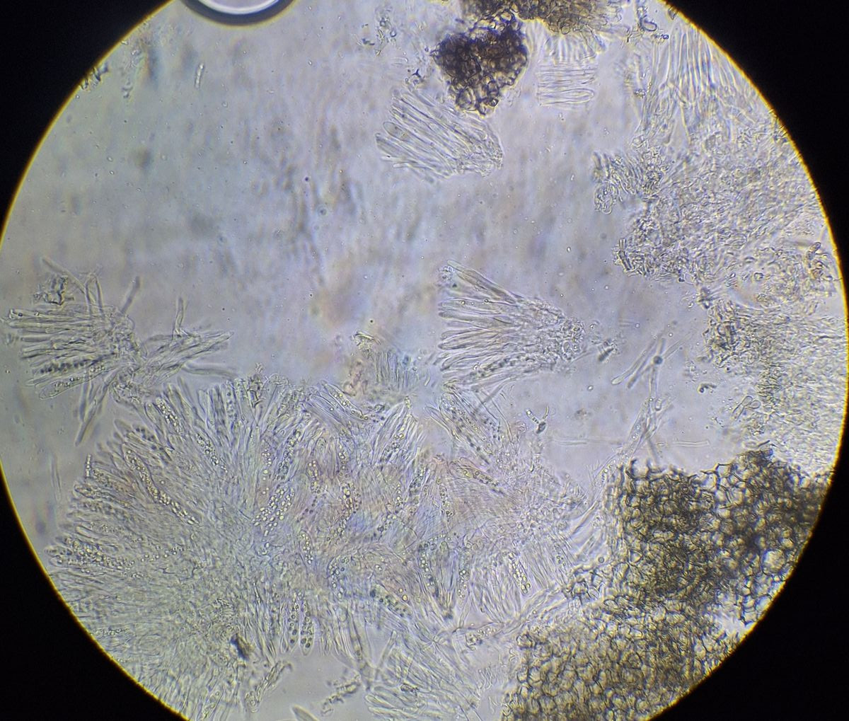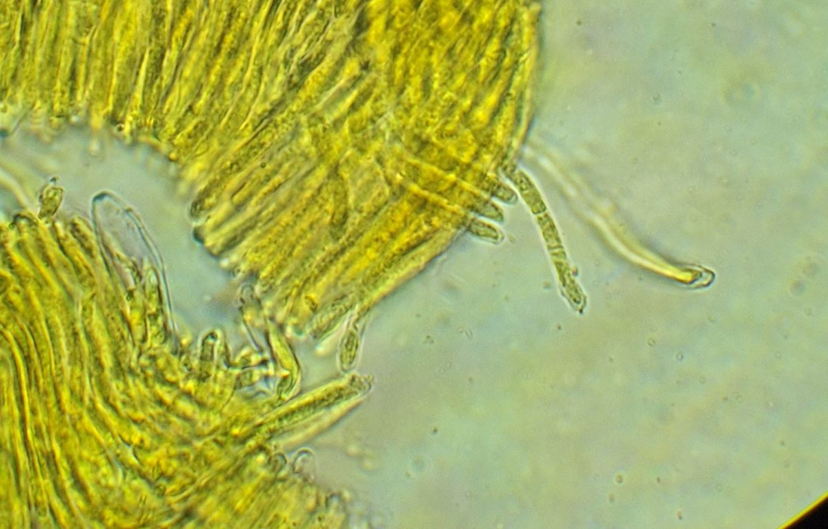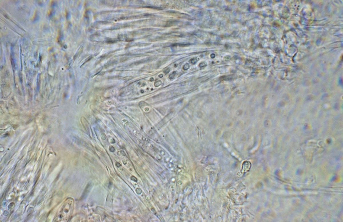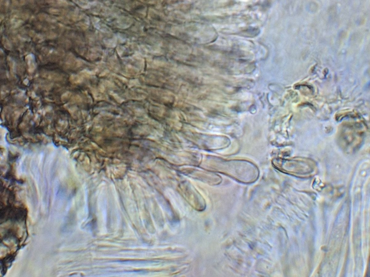 hier mein Versuch mit Jod (KJ in Alk) zu mikroskopieren. Wie nun allerdings jodpositiv bzw. jodnegativ auszusehen hat, habe ich nirgends gefunden. Da die Ascusspitzen sich nicht mit gelb verfärben, ist das aber wohl J-. Also nicht die vermutete M. coerulans. Das Substrat ist kein Wasserdost. Ich tendiere zu Arctium minus.