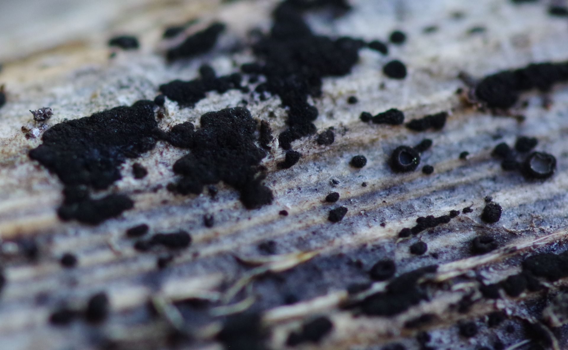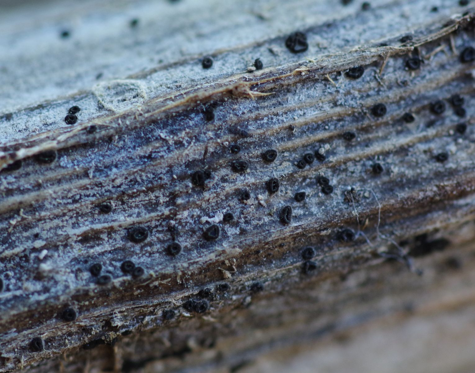 • N'abend, vom Rande eines Erlen-Weiden-Gestrüpps stammt dieser vermutlich Klettenstengel (da wächst sonst noch Wasserdost, Kerbel, disteln, Brennessel usw.) mit einem Becher, womöglich eine Mollisia, und schwarzem Zeug, das nur aus Sporen zu bestehen scheint.