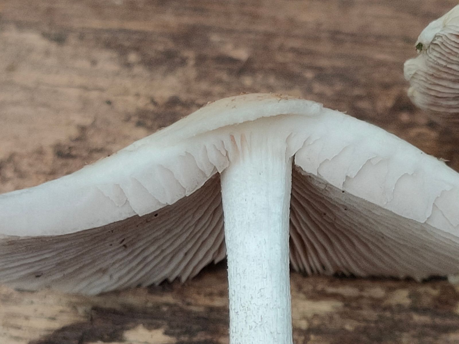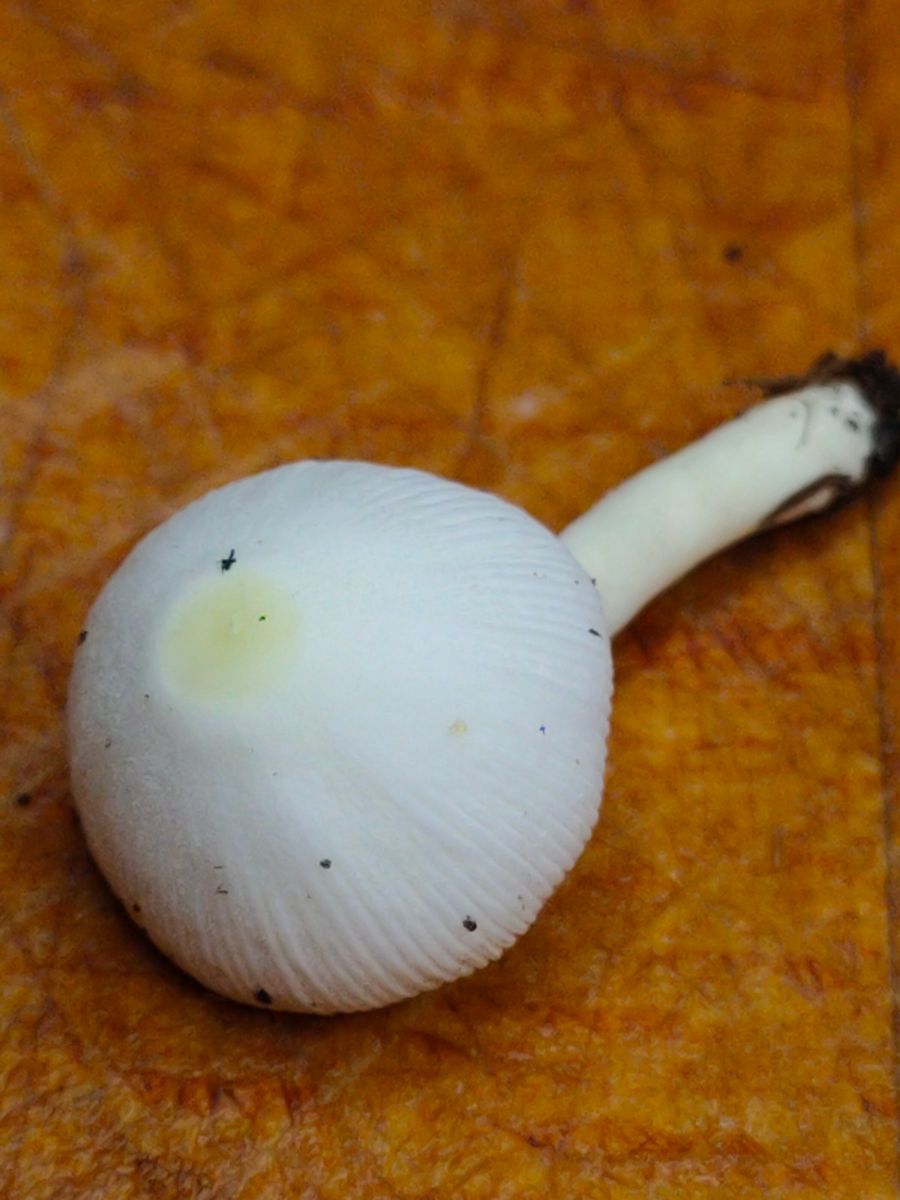 2. Aus meiner Sicht eine typsicher Leucocoprinus Faltenschirmling. Glockiger Hutform der eine deutliche Riefung und eine feine weisse Schuppung zeigt. Die weissen Lamellen stehen gut erkennbar frei. Der ganze FK hat einen minimalen gelben Ton. Die Hutmitte zeigt eine deutliche gelbe Zone. Das Sporenpulver ist ist weiss und hat einen gelben Einschlag.