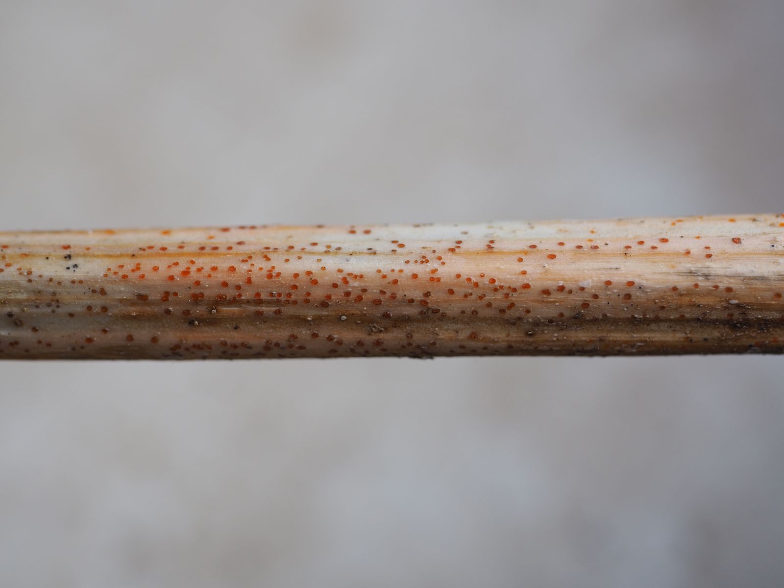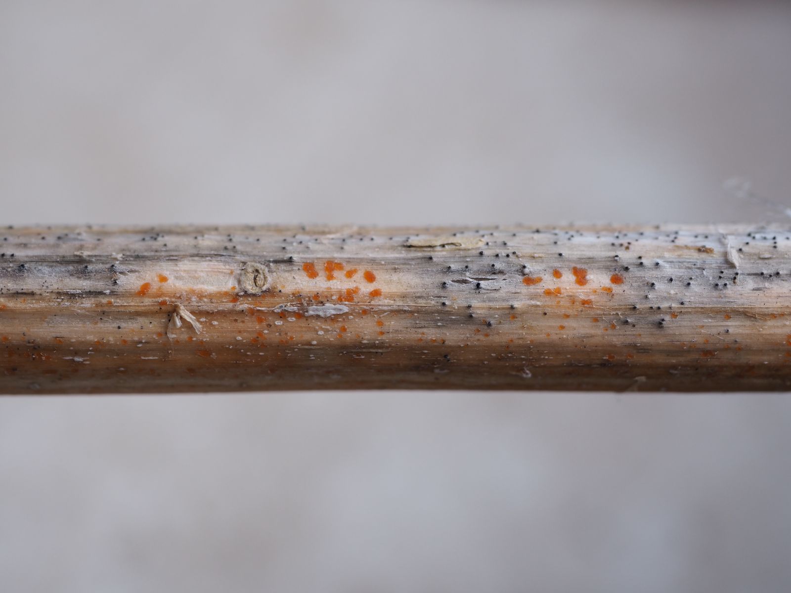 I) Beginnen möchte ich mit einem der häufigsten Pilze an Urtica namens Calloria neglecta bzw. seiner Anamorphe Cylindrocolla urticae. Man kann sie oft schon aus der Ferne identifizieren da sie gerne an noch stehenden Stängeln in luftiger Höhe die Stielrinde rasig überziehen und damit einen orangenen Farbeindruck hervorrufen. Die Teleomorphe ist dabei etwas dunkler orange gefärbt, während die Anamorphe hell leuchtend orange imponiert; die Größe der Fruchtkörper ist dabei ähnlich.