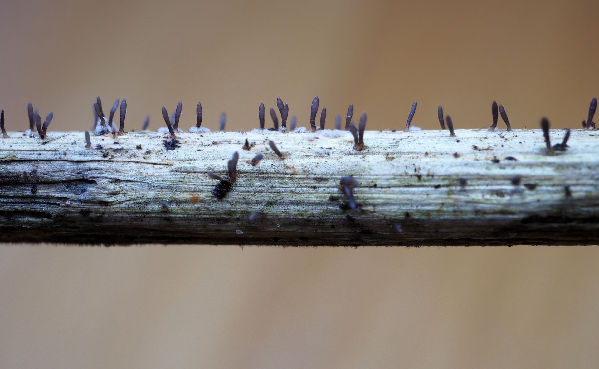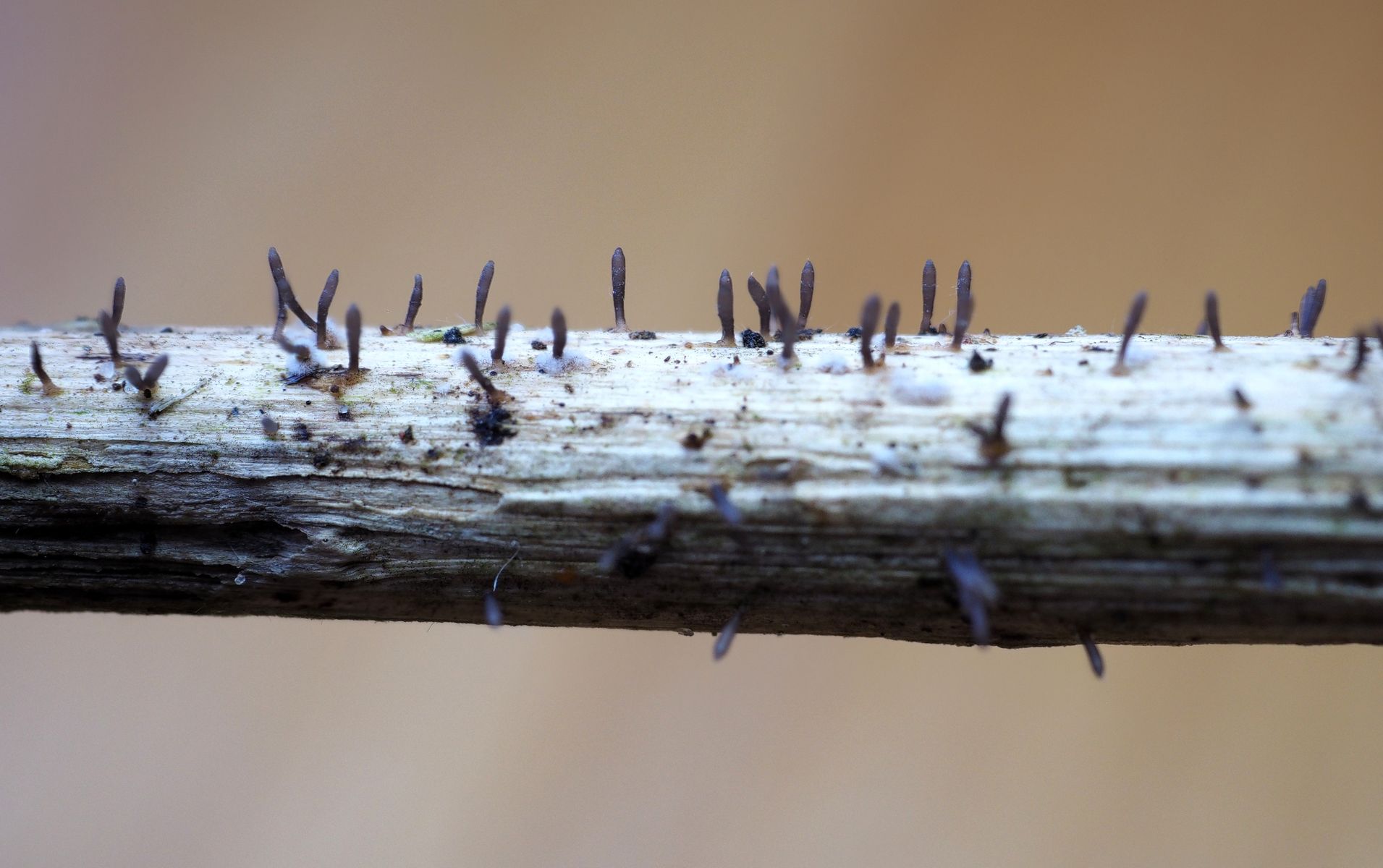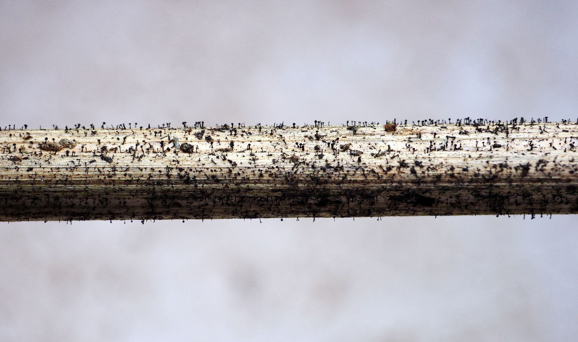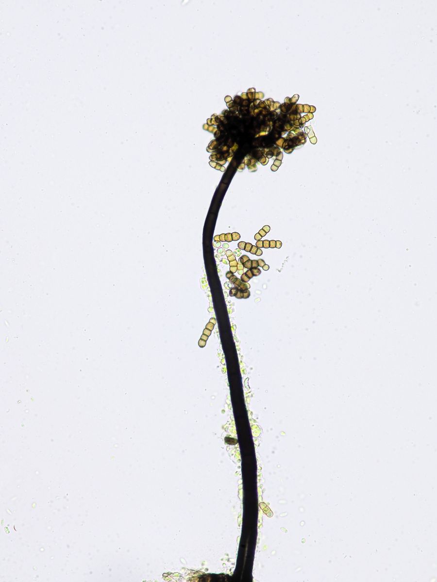 IV) Torula herbarum fällt durch seine pulverigen schwarzbraunen Beläge auf verrottenden Pflanzenstängeln auf. Die massive Konidiosporenproduktion hinterlässt auf den Fingern im Nu einen rußigen Abdruck. Die Sporen erinnern mich an die Newton-Kugel-Pendel die man in den 90ern gerne auf Schreibtischen nicht nur von Behördenmitarbeitern fand.