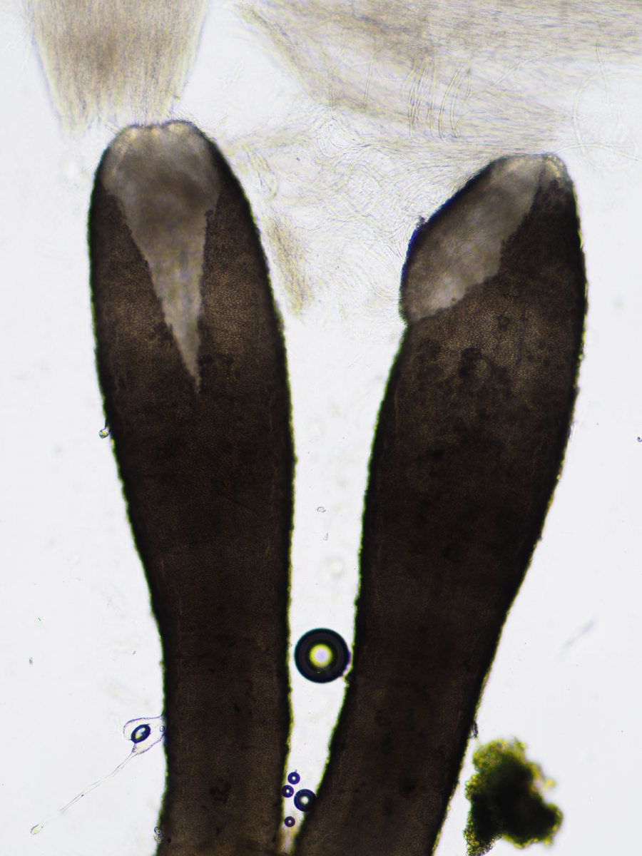 III) Ein Hingucker ist Acrospermum compressum. Diese kleinen Flachkeulchen sind überraschend stabil, ja fast gummiartig und stehen wieder auf wenn man sie umstreicht. Die fadenförmigen Sporen sind mit um 400µm extrem lang.