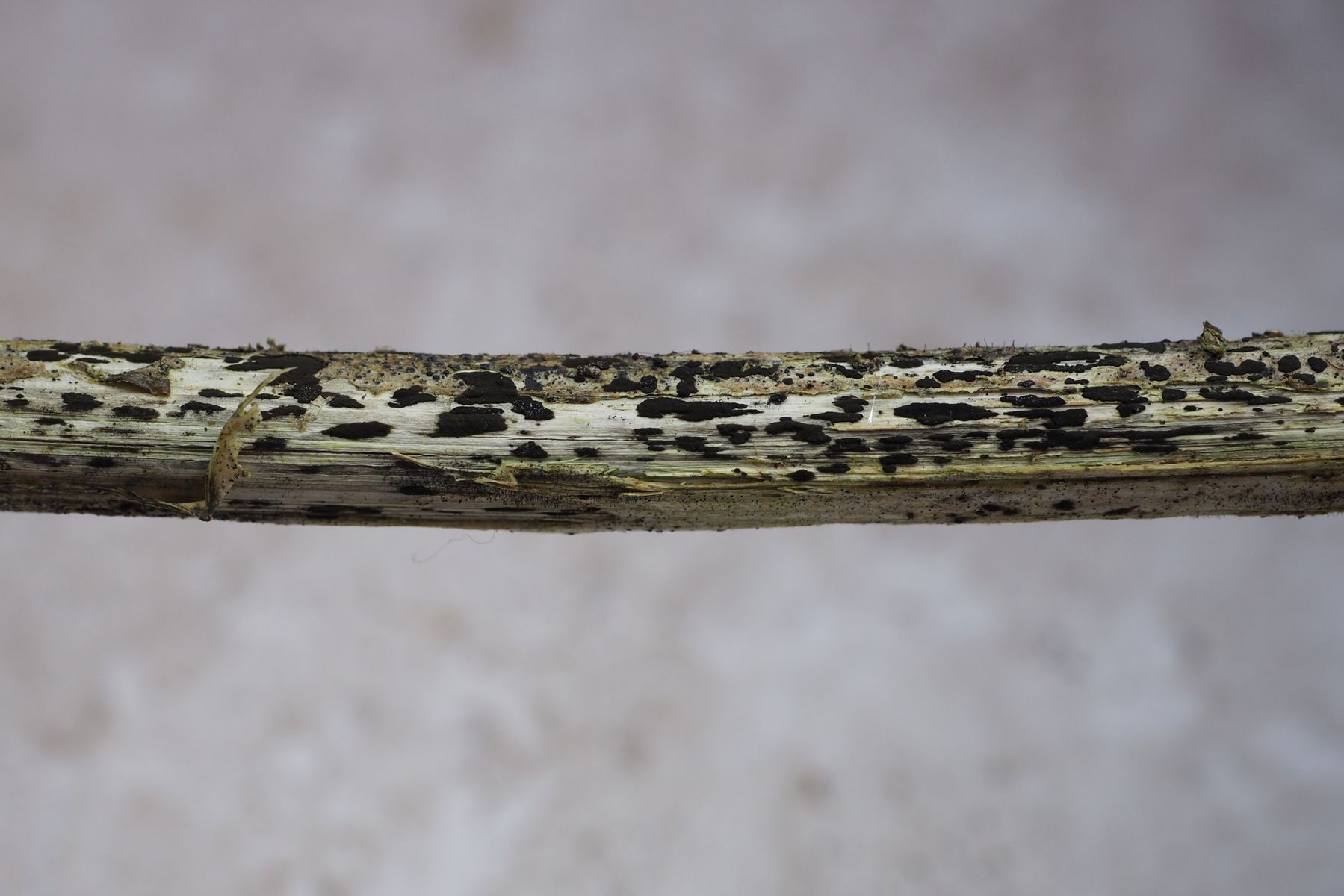 V) Einen glatten tiefschwarzen Belag verursacht Apomelasmia urticae an Brennnesselstängeln. Ob die von mir in einem Kratzpräparat gefundenen Asci (?) zur Teleomorphe gehören oder zu einem ganz anderen Pilz konnte ich nicht herausfinden. Diese Art muss ich mir nochmal genauer anschauen um das zu klären.