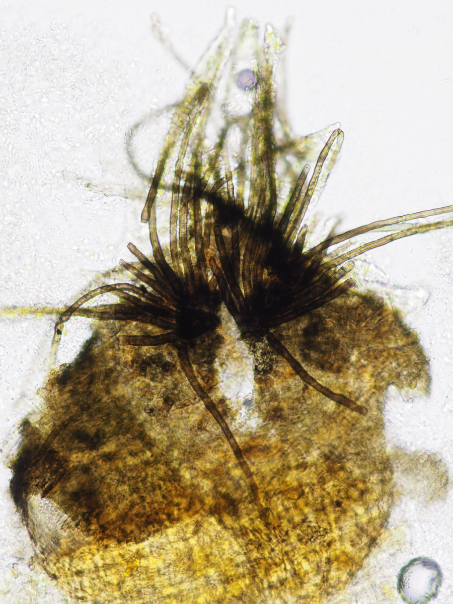 X) Dendryphion comosum: ohne Hilfsmittel erkennt man nur einen filzigen olivbraunen Belag. Unter der Lupe lassen sich aber Kolonien von winzigen „Bäumchen“ aka Konidiophore erkennen, an deren Spitze die mehrzelligen blasigen Konidien sitzen. Ihr Vorkommen ist nicht auf Urtica beschränkt.