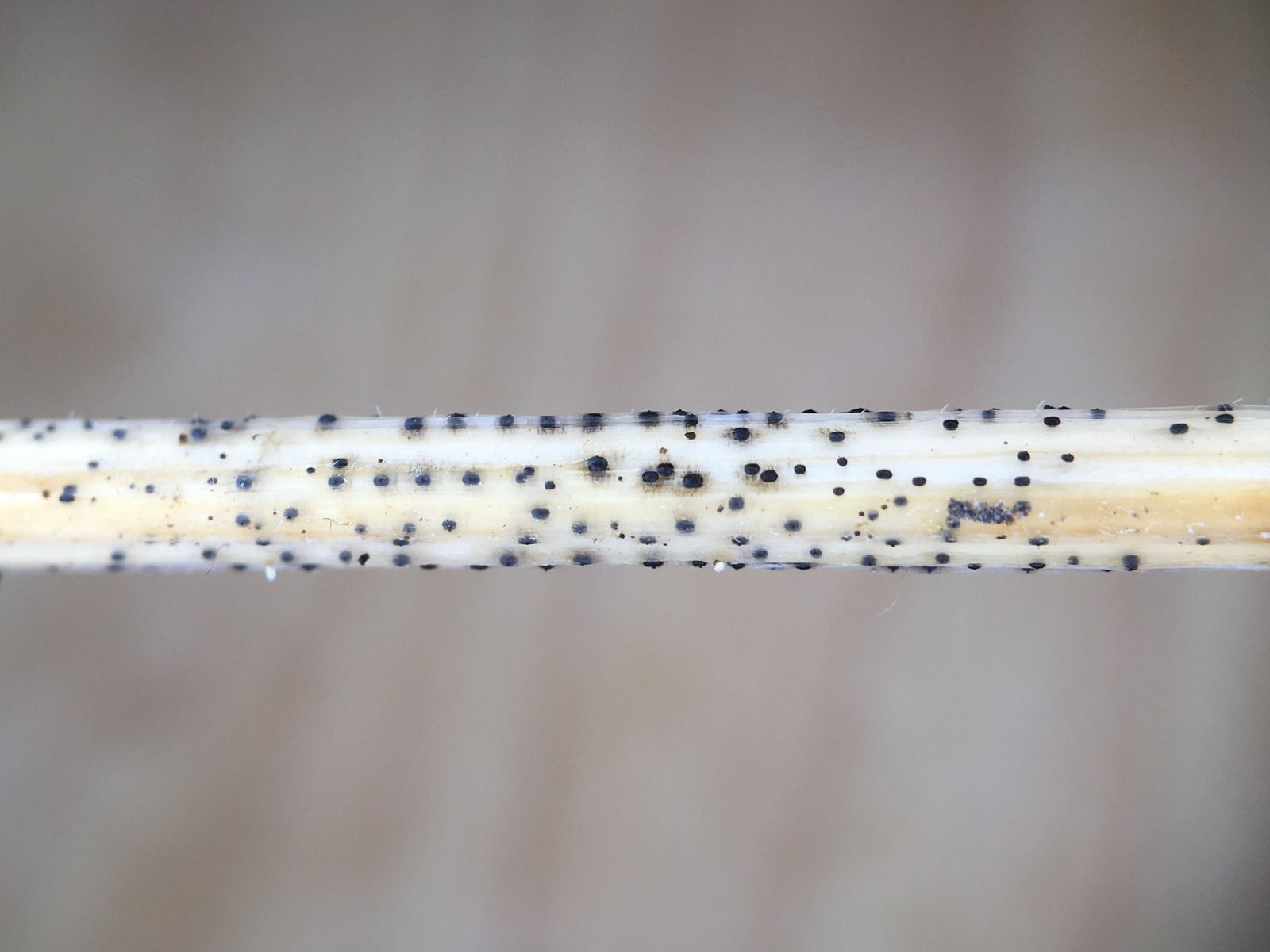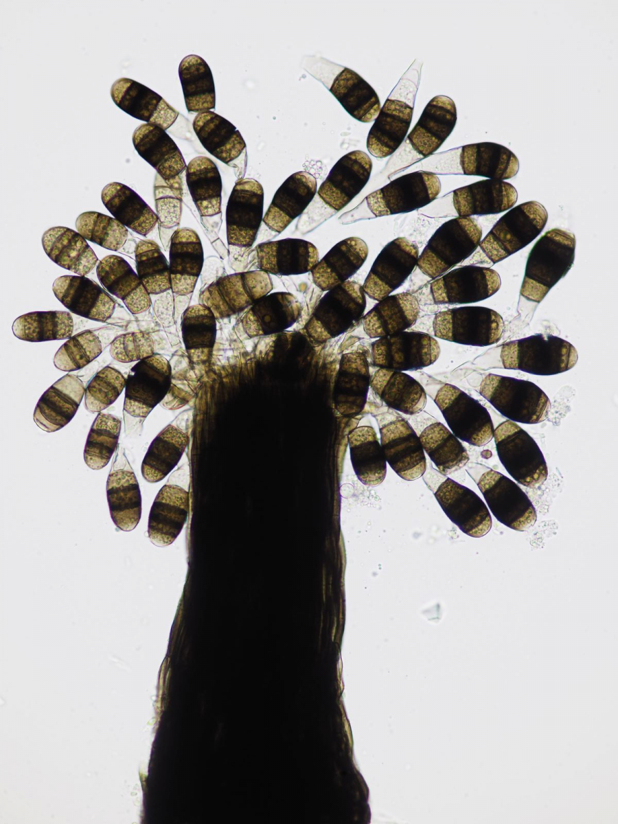 II) Vermutlich etwa ebenso häufig ist Leptosphaeria acuta, ein aufgrund seiner charakteristischen Form* ebenfalls bereits im Feld anzusprechender Pilz.