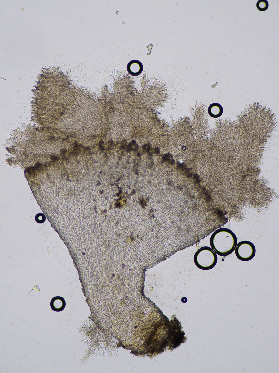 - Clitocybe sp (nicht bestimmbar, zu jung und Sequenzierung fehlgeschlagen, wuchs direkt an einer jungen Stammbasis einer austreibenden Brennessel, aber wohl Zufall)