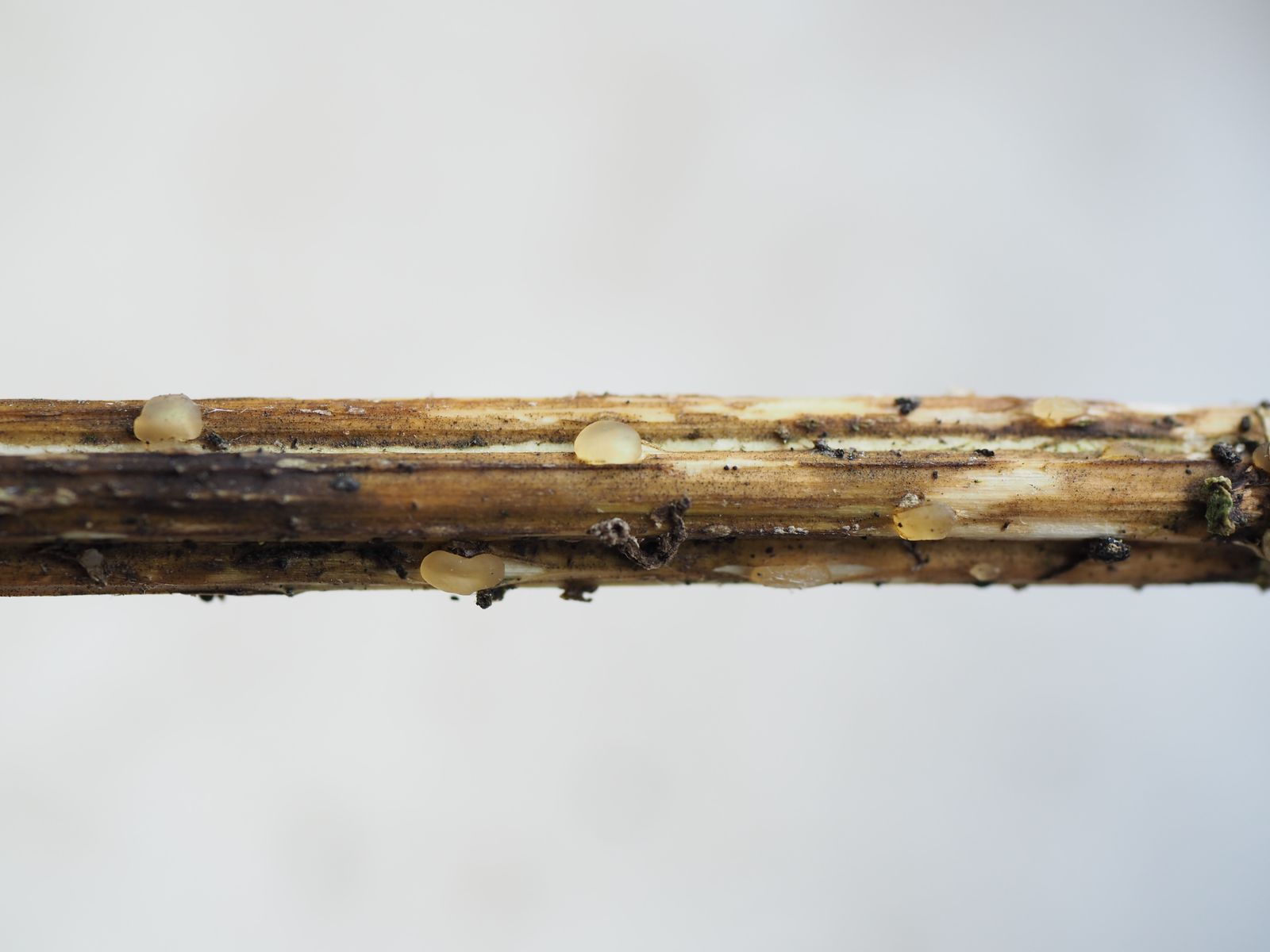 XII) Diese gelblichen, aus den Spalten im Stängel hervorbrechenden Gebilde (ca 1-2mm) hielt ich draußen zunächst für Becherlinge. Sie stellten sich allerdings als steinhart heraus. Nachdem sie mit Wasserkontakt blasig aufquollen vermutete ich Gallertpilze. Sie blieben aber auch gequollen so extrem hart, dass mir leider kein mikroskopisches Präparat gelang. Ich habe mal bei Björn angefragt, der sich ja zuletzt häufiger mit dem Geglibber beschäftigte. Er schloss Gallertpilze aus und vermutete es könnten Sklerotien sein. Ich werde den Stängel mal in den Garten verfrachten und beobachten ob irgendwann noch was draus wächst.