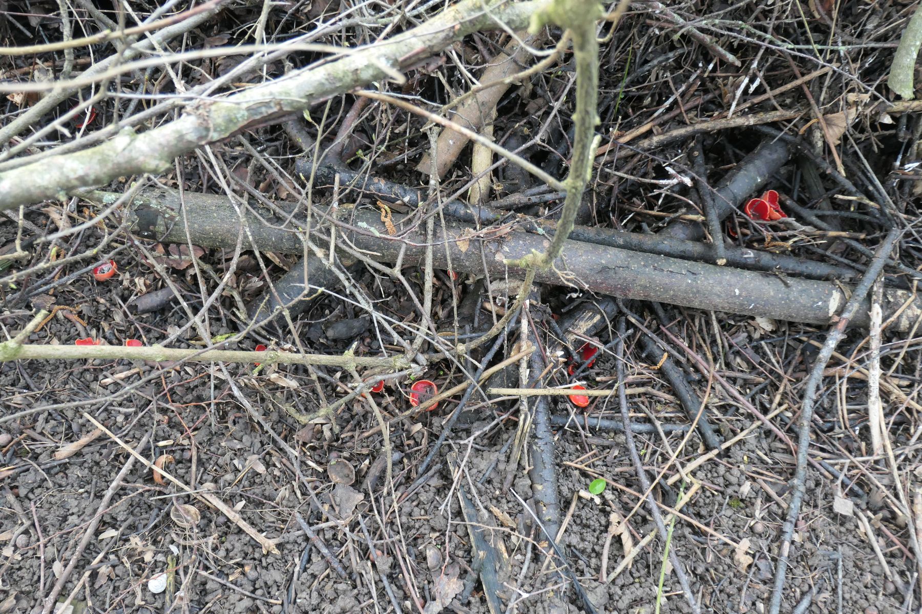 Vorgestern entdeckte ich zu meiner grossen Freude rund um einen mehrjährigen Asthaufen von Heckenabschnitt (Feldahorn, Hainbuche, Rosa canina, Schwarzdorn ua)