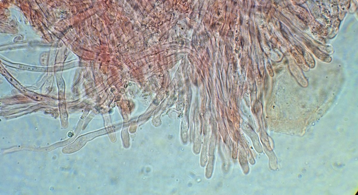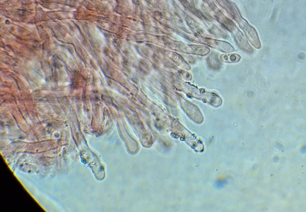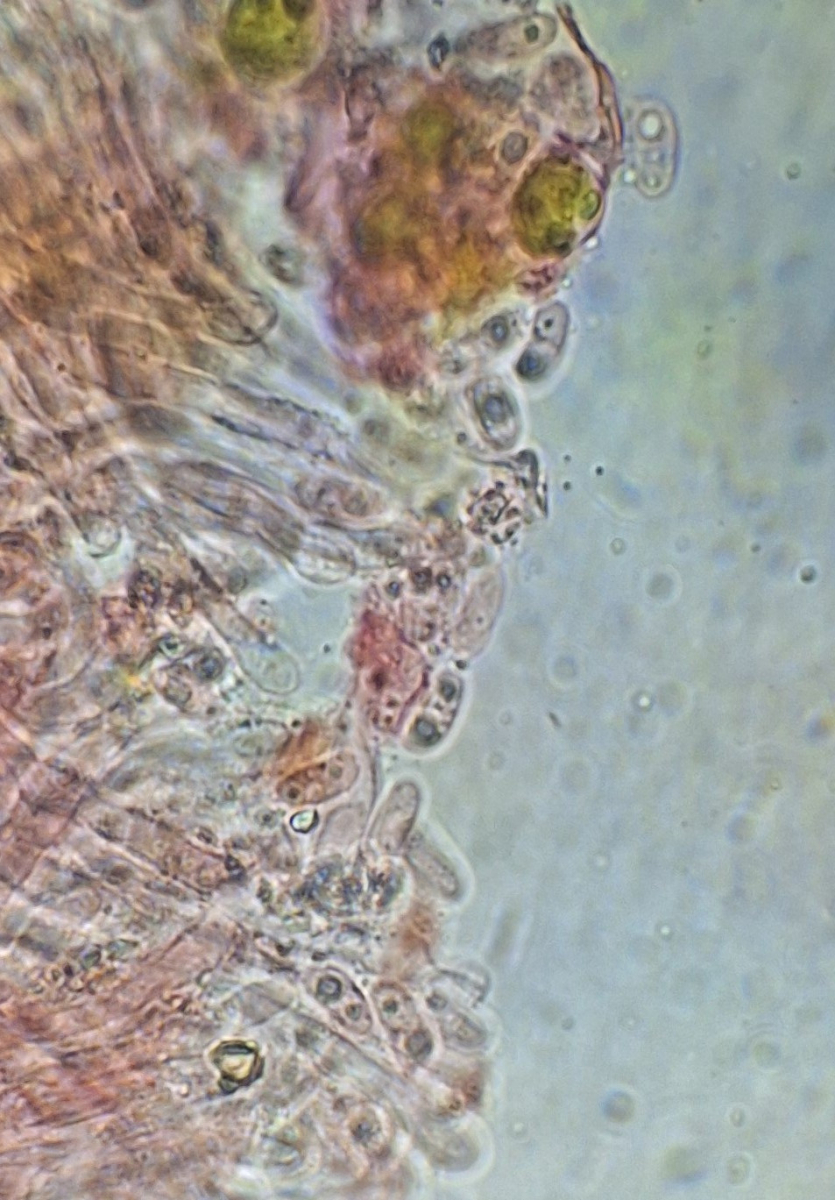 Septen habe ich keine gesehen, folglich auch keine Schnallen. Ob die langen schlanken am Ende verdickten und oft mit Kristallen besetzten Zellen jetzt Basidien oder Zystiden sind, ist mir nicht klar, da ich keine Sterigmenreste sehe, neige ich zu letzterem. Die Sporen sind bohnenförmig, 7-8 * 3-4 µm groß, zumeist mit großen Tropfen.