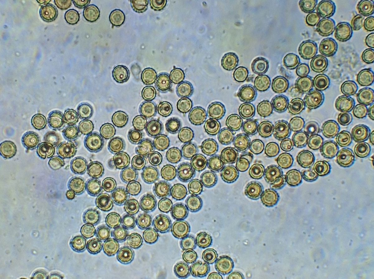 Sporen 4-5 µm, gelblich, kurz warzig/gestachelt, teils mit kurzen Sterigmenresten/Apiculus <1,5 µm. Oft mit Tropfen.