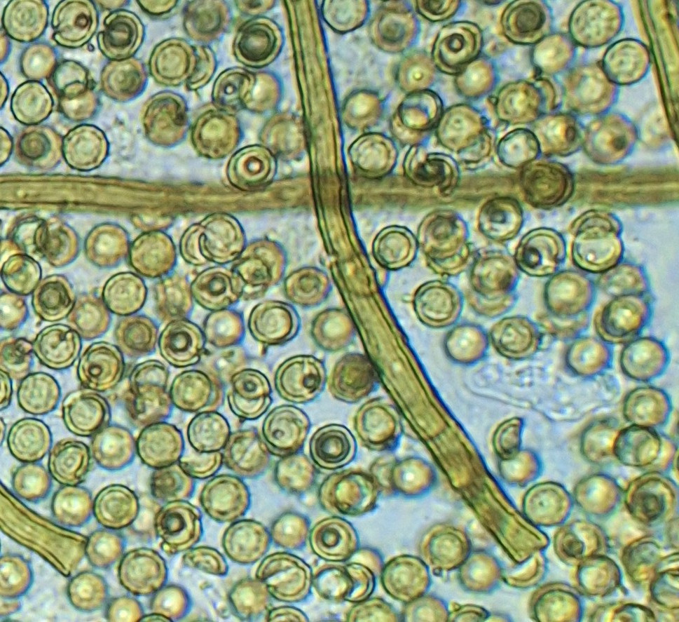 Hier bin ich mir bei der Verzweigung der Hyphen schon unsicher, ob ich Richtung Bovista/Bovistella oder Lycoperdon schlüsseln muss. Es sind sehr dicke Hyphen vorhanden, die sich aber nur in einer Hierarchie verzweigt, ganz selten in zwei. Teilweise blasig verdickt, bis 15 µm, teilweise mit längeren Blasen, deren Grenzen, wie Septen wirken. Septen sehe ich nicht - bzw, nur ganz vereinzelt in den hyalinen Hyphen. Der untere Teil könnte steril sein, jedoch ohne ausgeprägte Grenze. Die Sporen sind glatt, 4-5 µm, teils mit sehr kurzem Apikulus.
