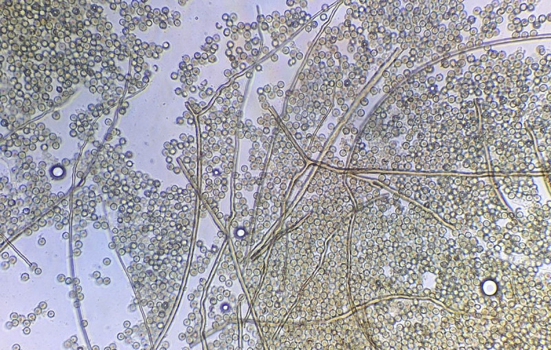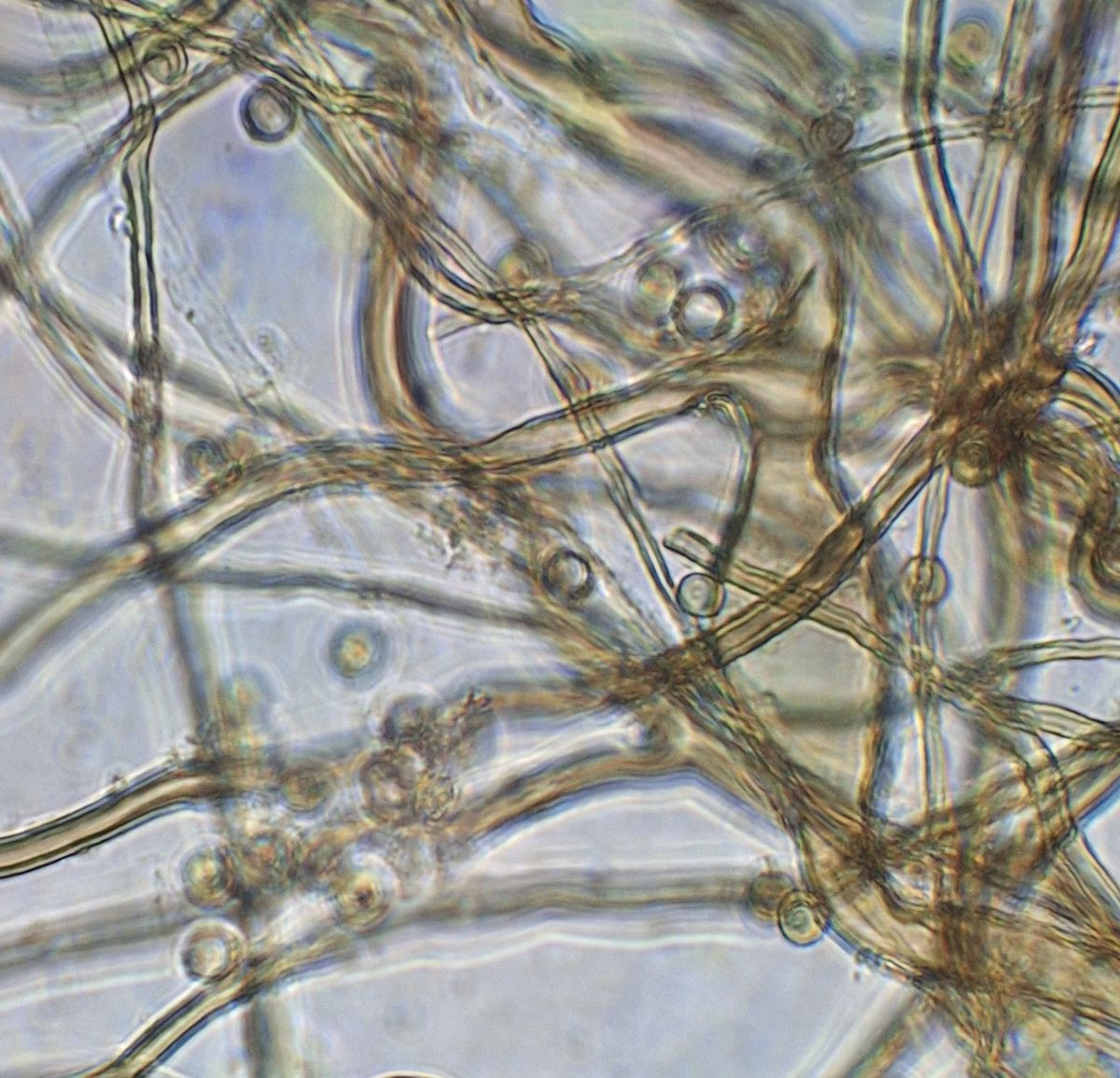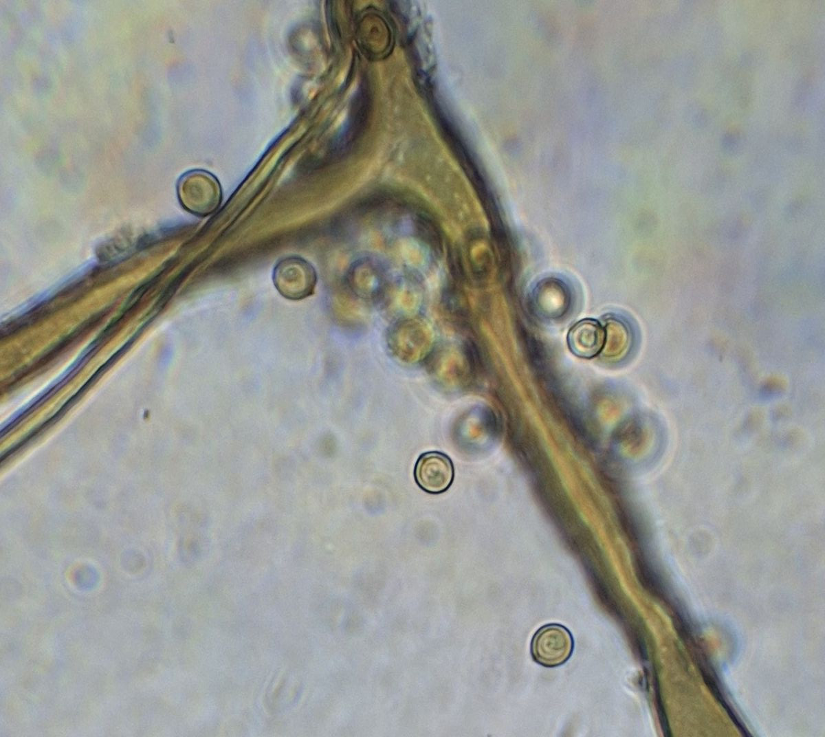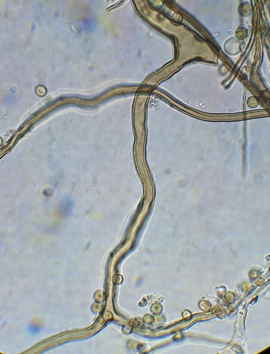 Hyphen gelegentlich verzweigt, nicht septiert, mäßig dicke Wände, die nicht unterbrochen sind. Gelegentlich mit vereinzelten Bläschen/Tropfen.