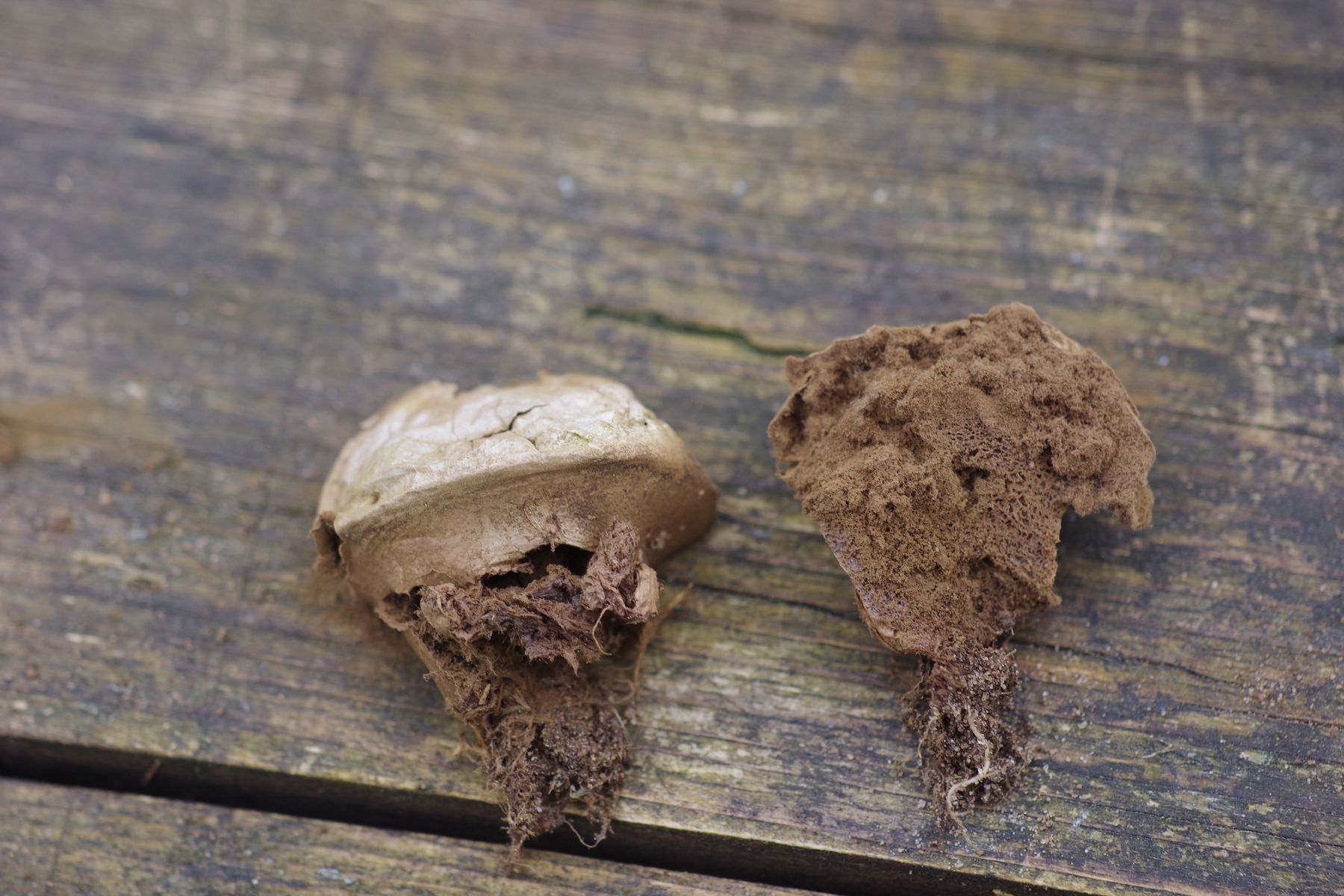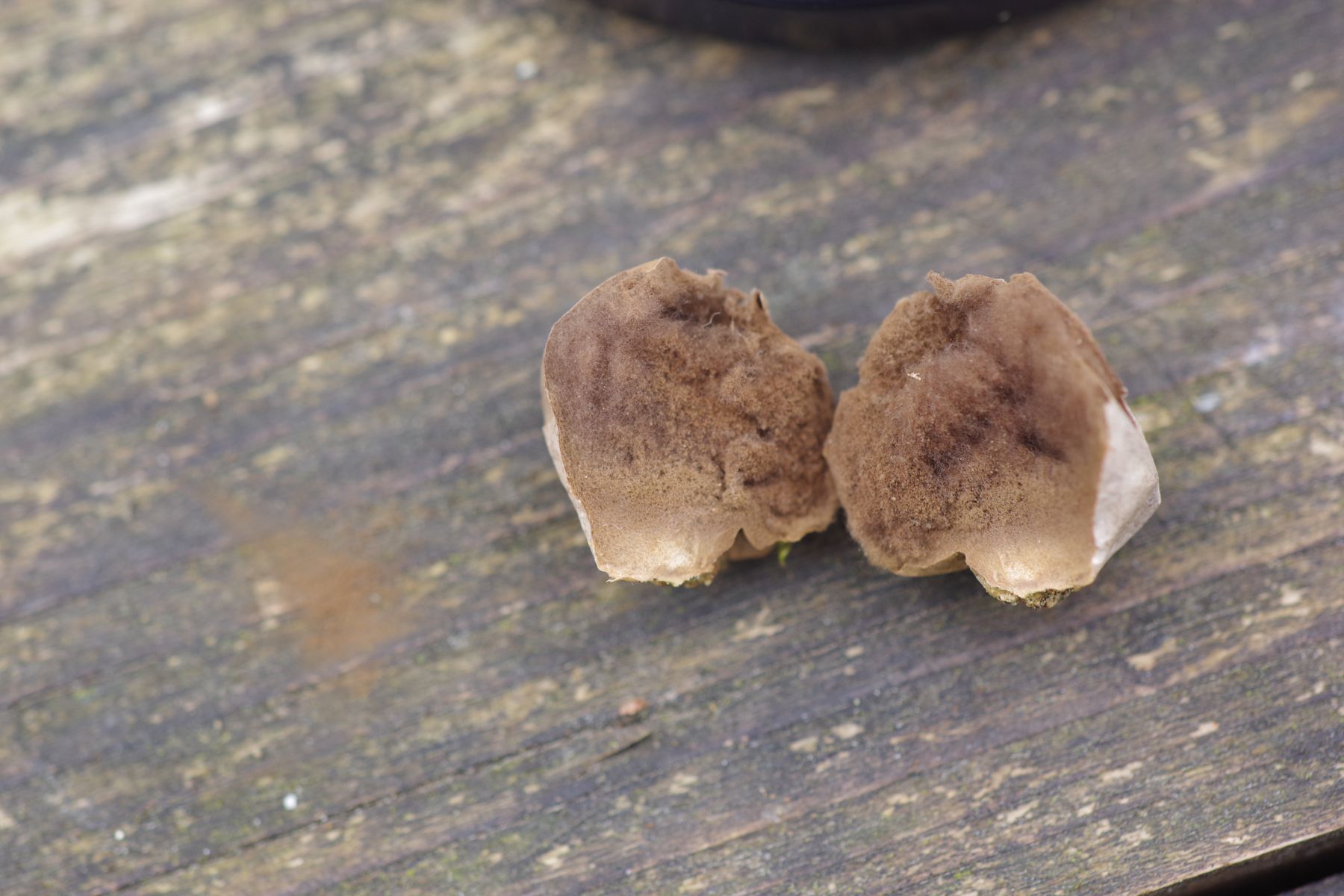 1) Lycoperdon sp. am Waldrand (Fichte, Kiefer, Birke, Eiche) auf Sand, bis 3,5 cm groß.