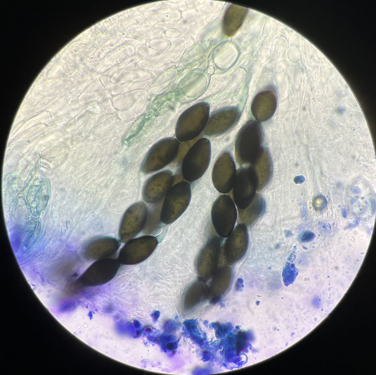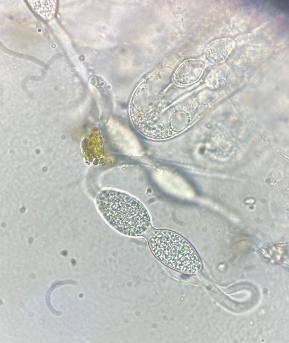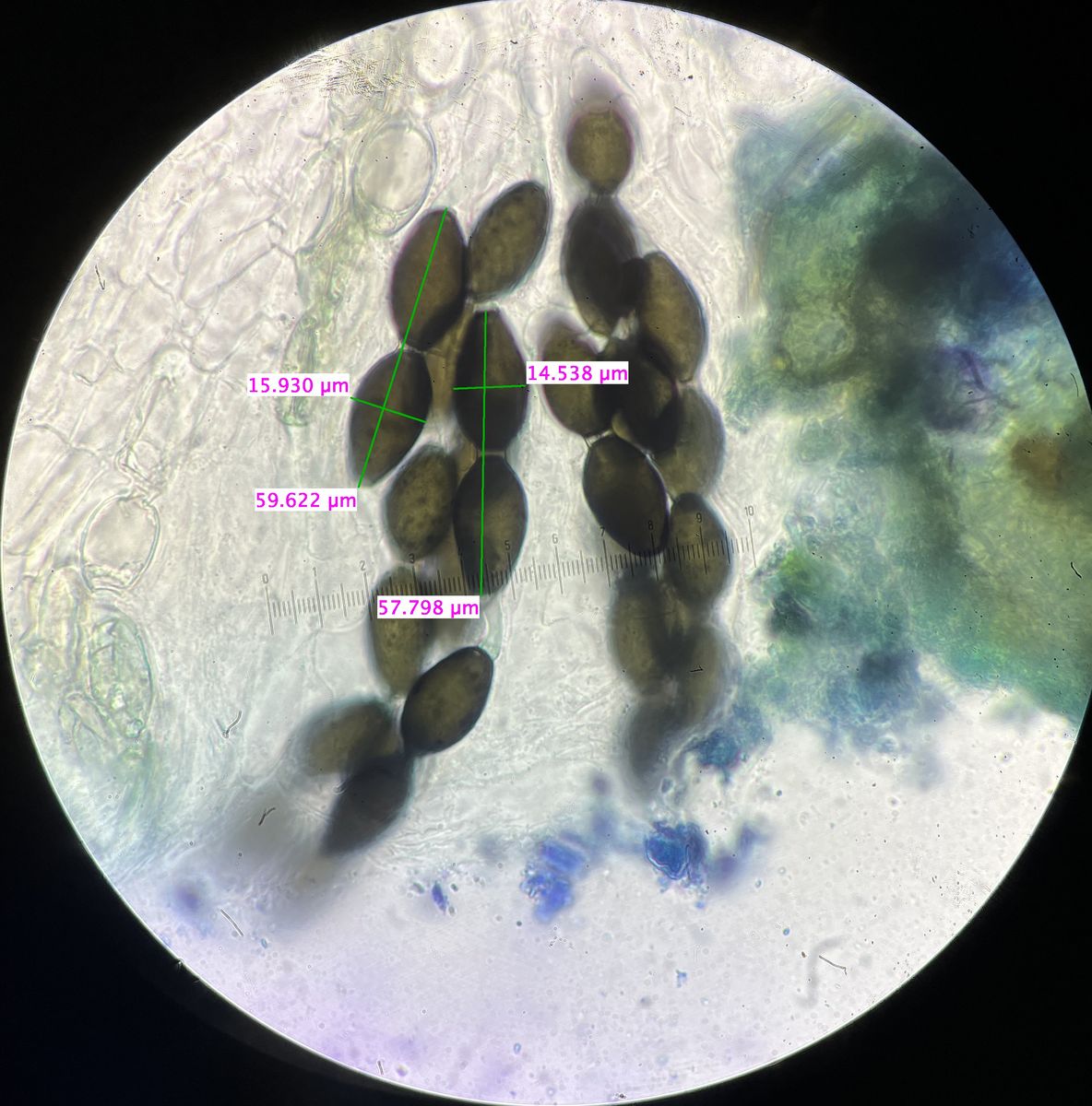 Mir fällt gerade auf, daß die Sporen bei Deinem Fund nur eine mittlere Septe haben und ansonsten keine Zeichnung haben. Bei meinen Funden hatten die reifen braunen Sporenzellen jeweils noch einen dünnen dunkelbraunen Querstreifen in der Nähe der Septe. Die Sporenzellen waren bei meinen Funden gefühlt länger und schlanker und die Anhängsel breiter.