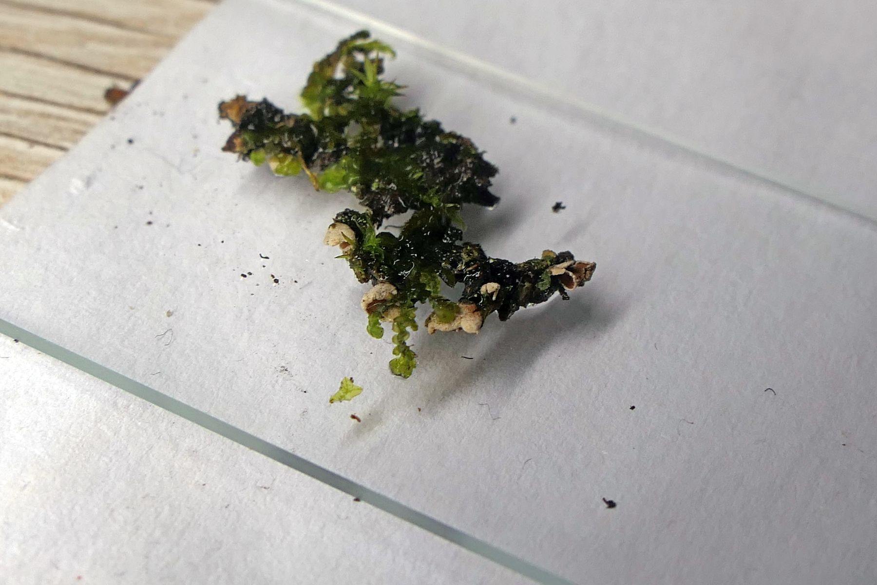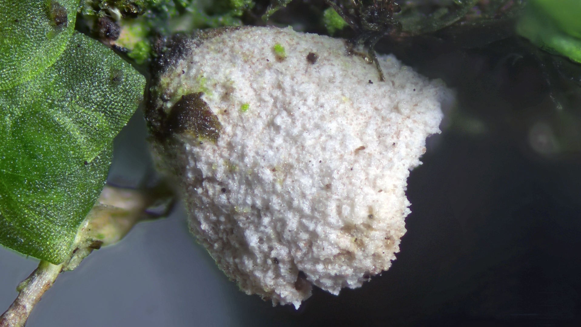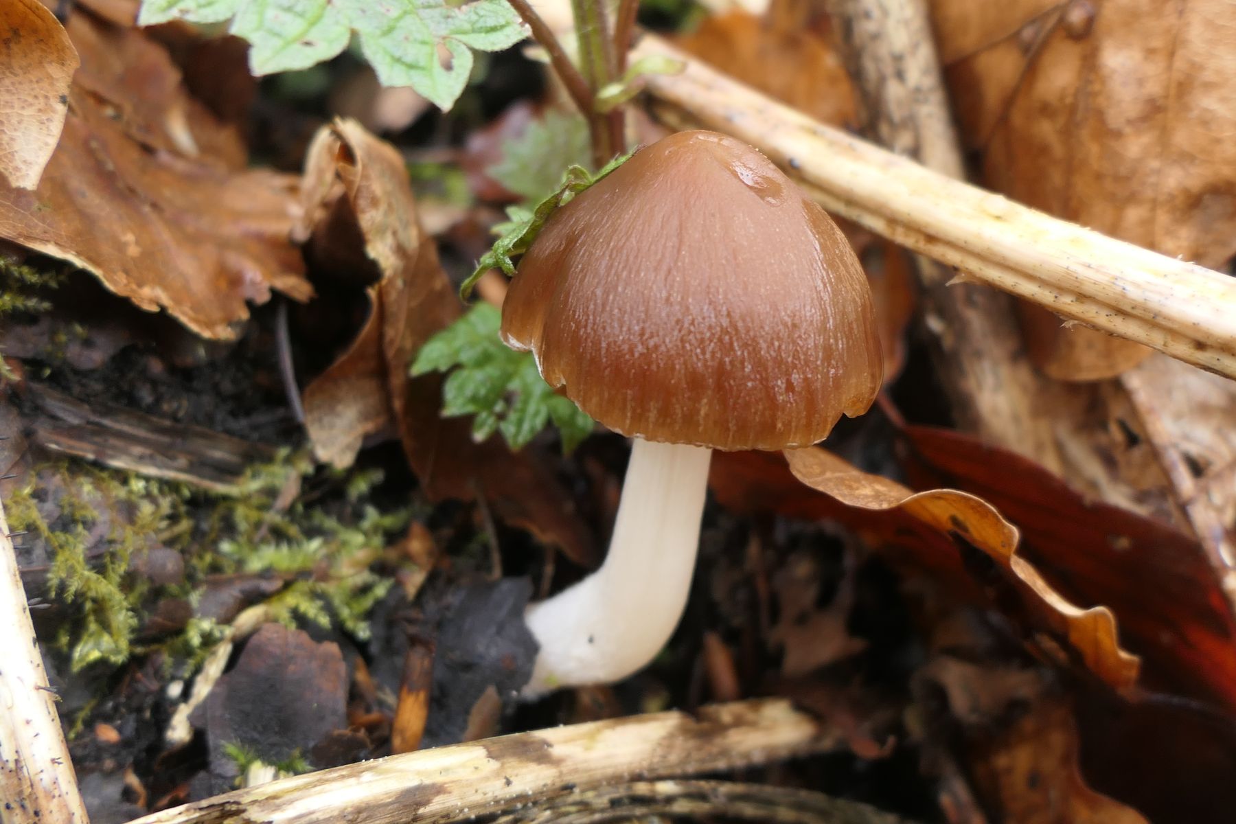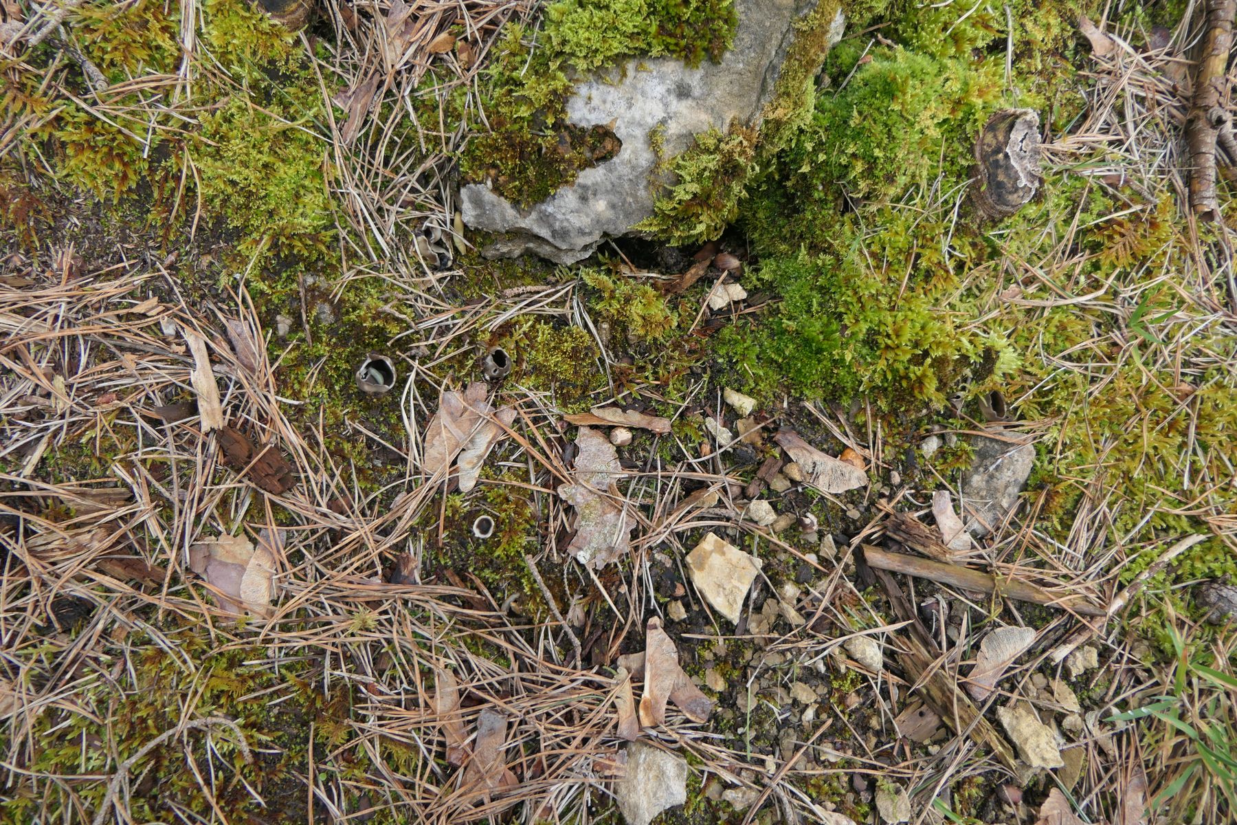 Interessant waren noch kleine weiße Pilze im Moos zwischen den Haselkleiebecherlingen (man achte im unteren Bild auf die weißen Pünktchen, kaum zu erkennen). War irgendwie an Arrhenia retiruga erinnert, was natürlich hinten und vorne nicht passen konnte. Auch weil sich braunes Sporenpulver zeigte: