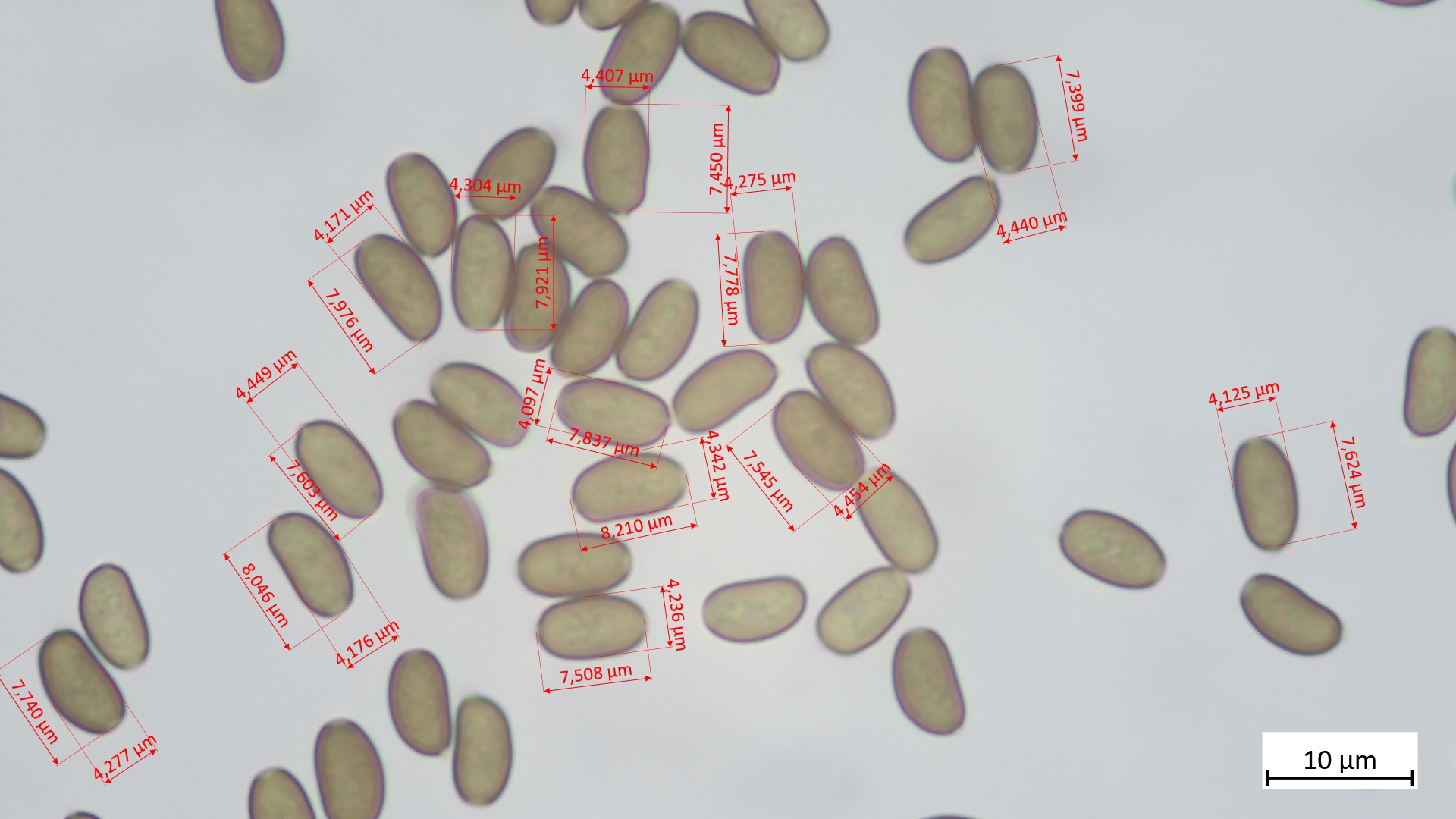7,4-8,2 µm (av. 7,7 µm, SD 0,2 µm) x 4,1-4,5 µm (av. 4,3 µm, SD 0,1 µm); Q = 1,7-1,9 (av. 1,8, SD 0,1)(n = 13)