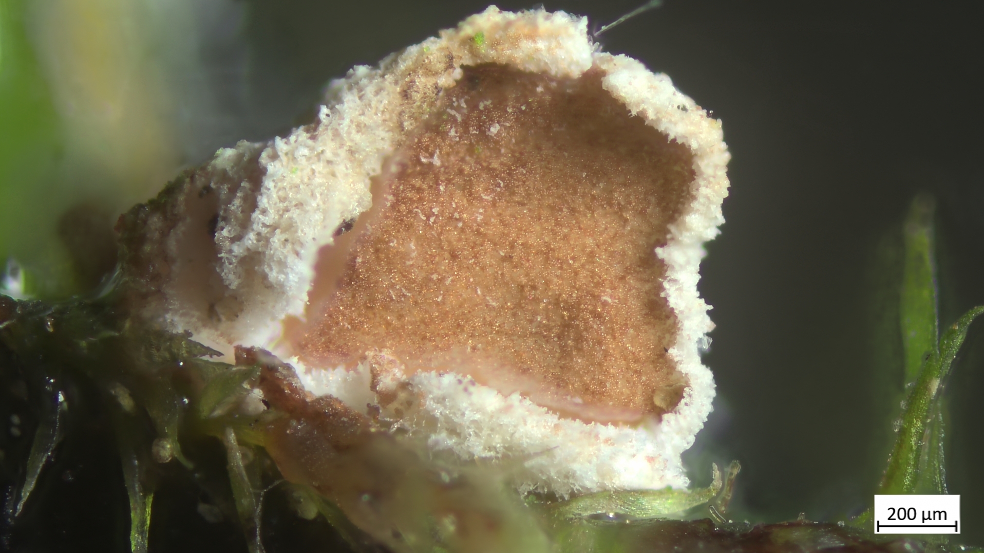 03 Chromocyphella muscicola - das Moosbewohnende Braunsporbecherchen (oder Moosflaumschälchen)