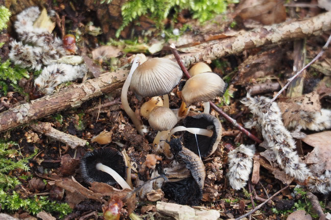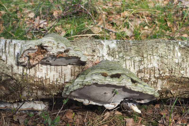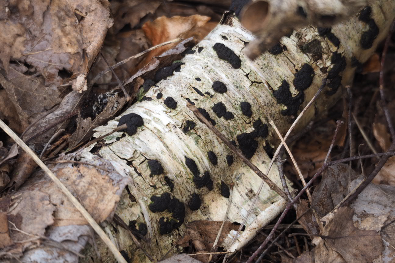 Kurz bevor ich beim Auto ankam, fielen mir noch grau-schwarze Gebilde an liegender Birke auf, die ich für die Vielgestaltige Kohlenbeere Hypoxylon multiforme halte.