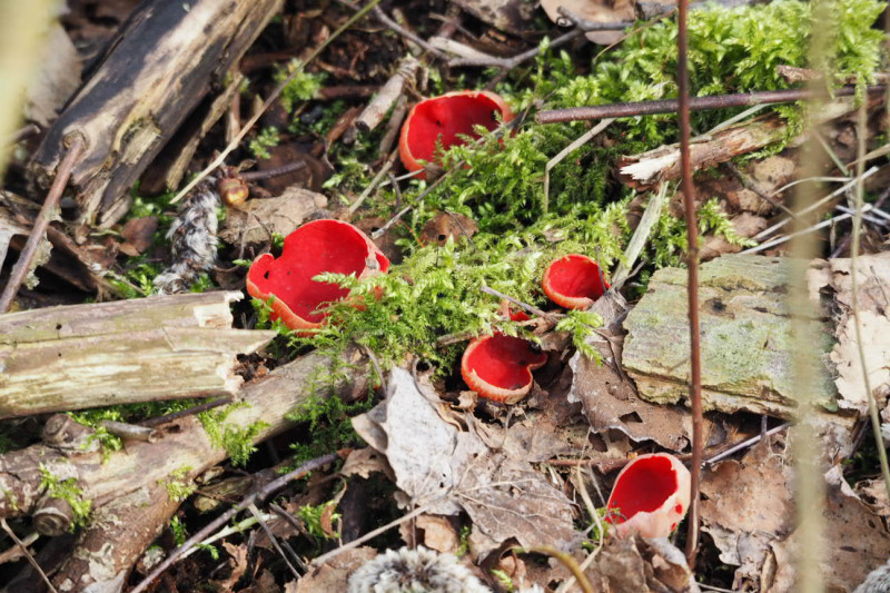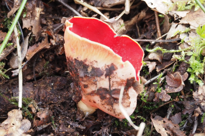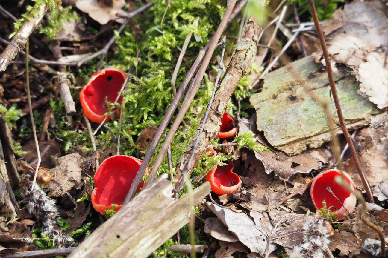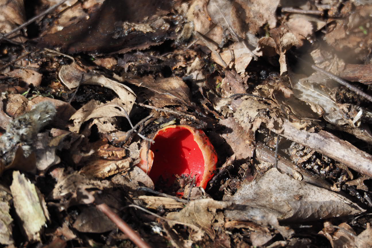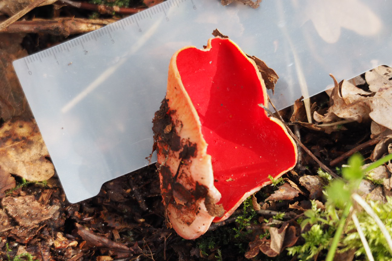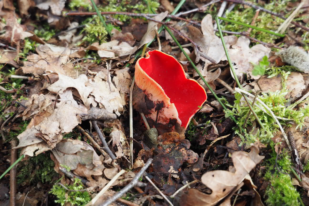 Und dann für mich das Highlight des Jahres, mein Perser (persönlicher Erstfund): Einer der roten Prachtbecherlinge Sarcoscypha.