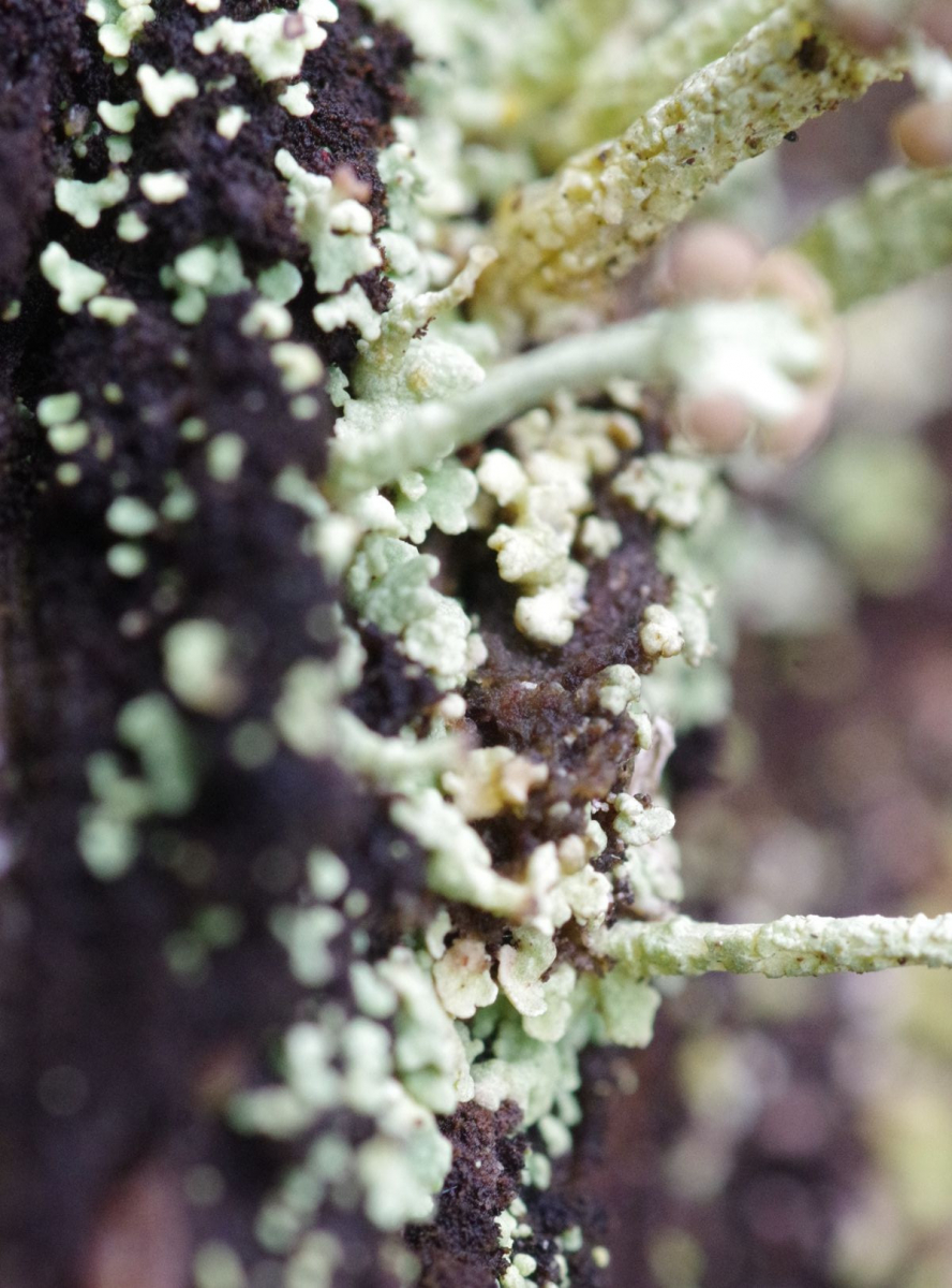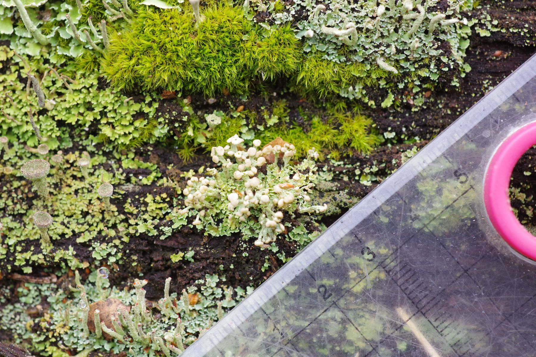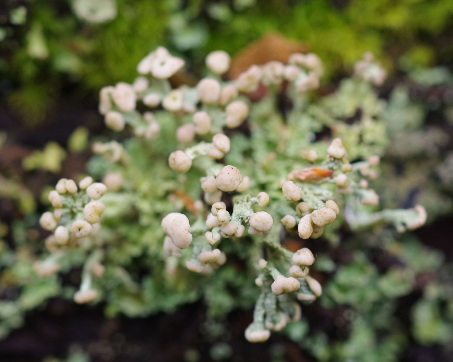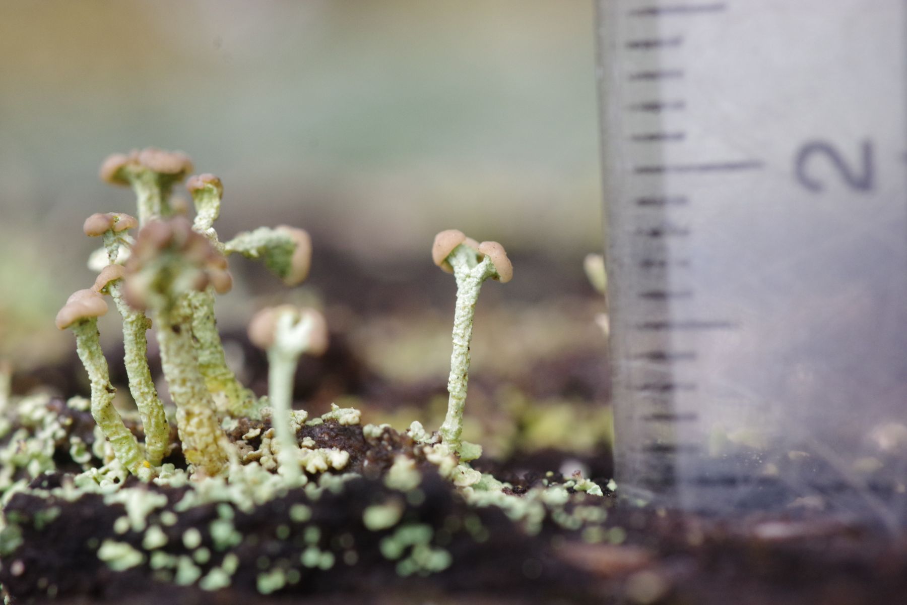 in der früher gezeigten Kollektion hatte ich für eine hellfrüchtige Cladonia schon C. botrytes als Arbeitsnamen erwähnt. Nach Durchsicht der Literatur komme ich zum Schluss, dass hier dazu keine Verwechslungsart in Frage kommt. Deswegen ein paar mehr Bilder dazu.