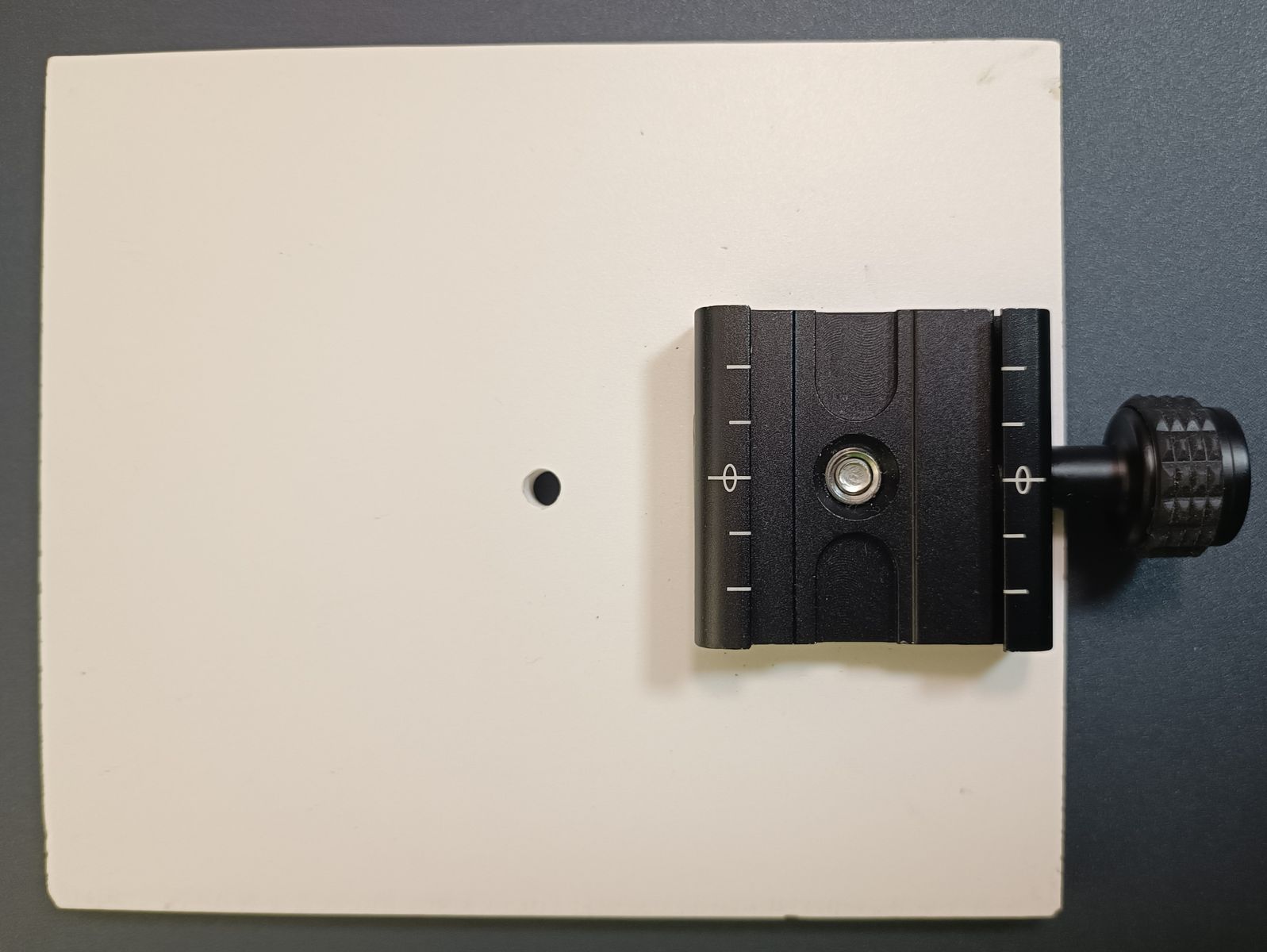 Um die Kamera direkt auf den Boden stellen zu können, habe ich mir eine Schnellwechselplatte auf ein Stück 1 cm Schaum-PVC montiert. Das ist praktisch, um die Kamera direkt auf dem Boden zu haben. Und man kann gut Unterbauen.