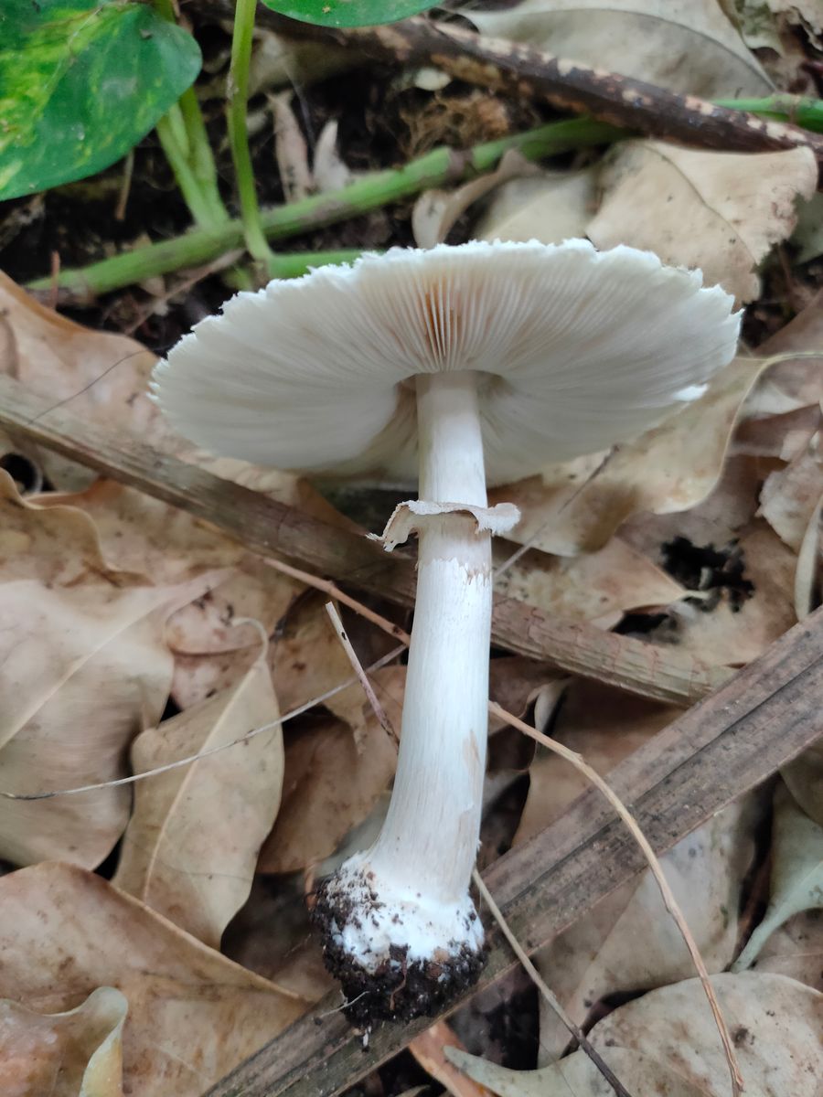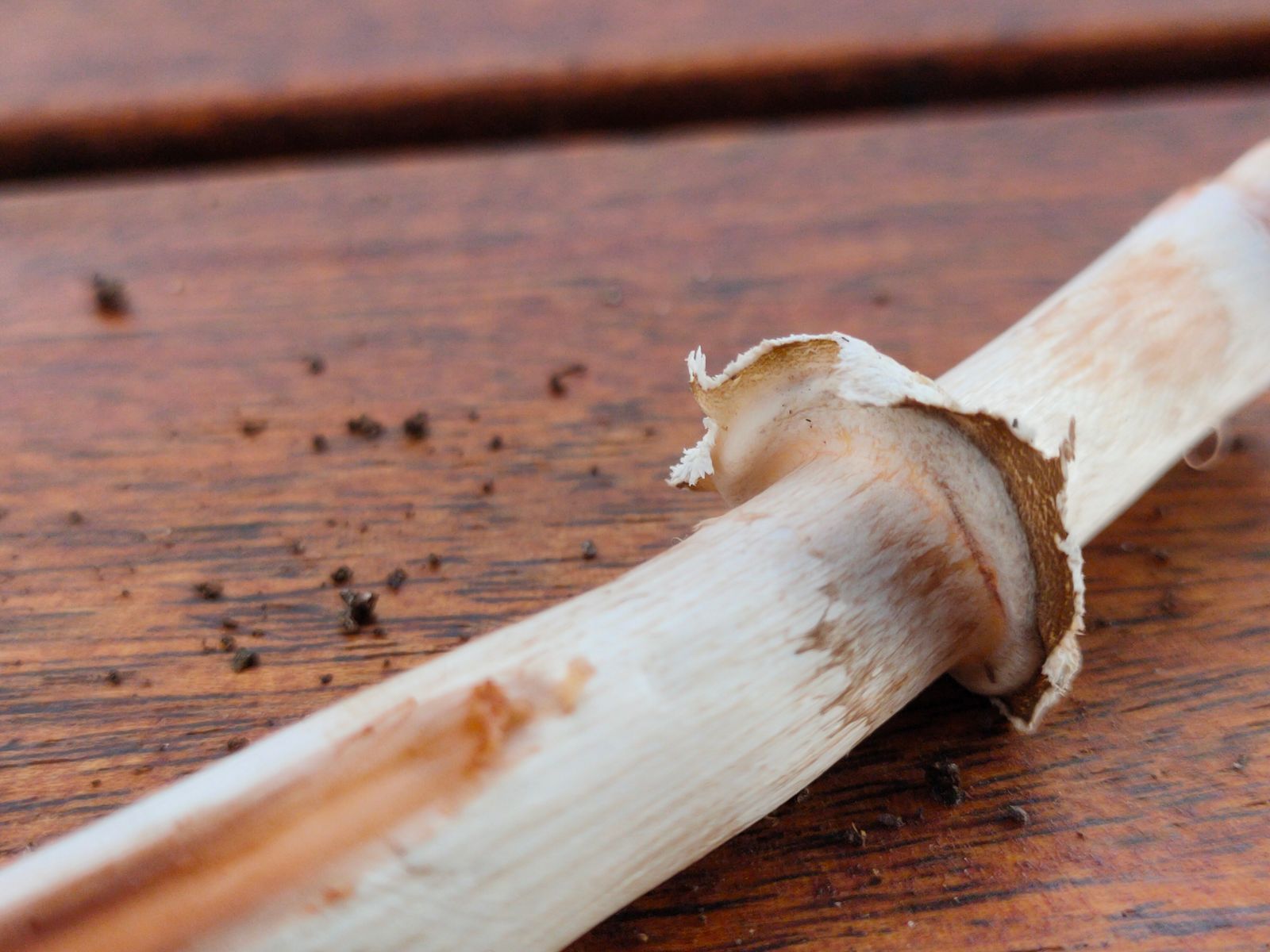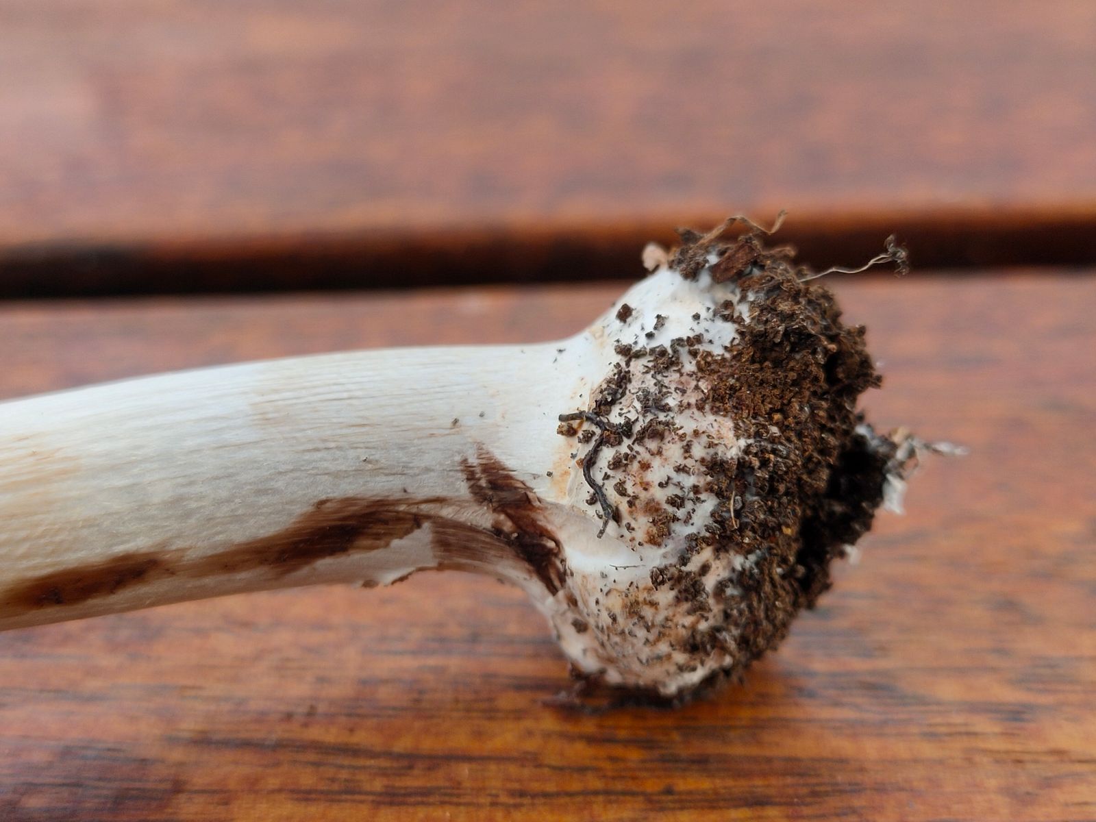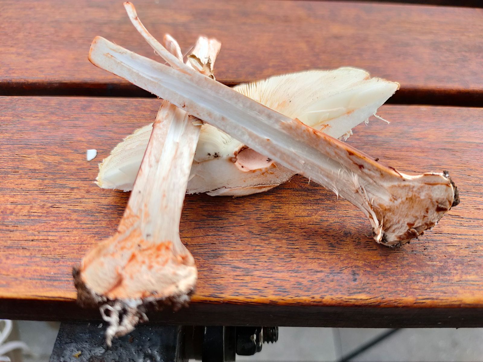 Das Fleisch zeigt schon eine deutliche Reaktion, aber aus meiner Sicht ist diese eher Rosabraun. Der Stiel hat eine deutlich gerandete Knolle und ist hohl. FK ist ca 10 cm im Hutdurchmesser, die Lamellen sind deutlich frei und überraschend spröde.