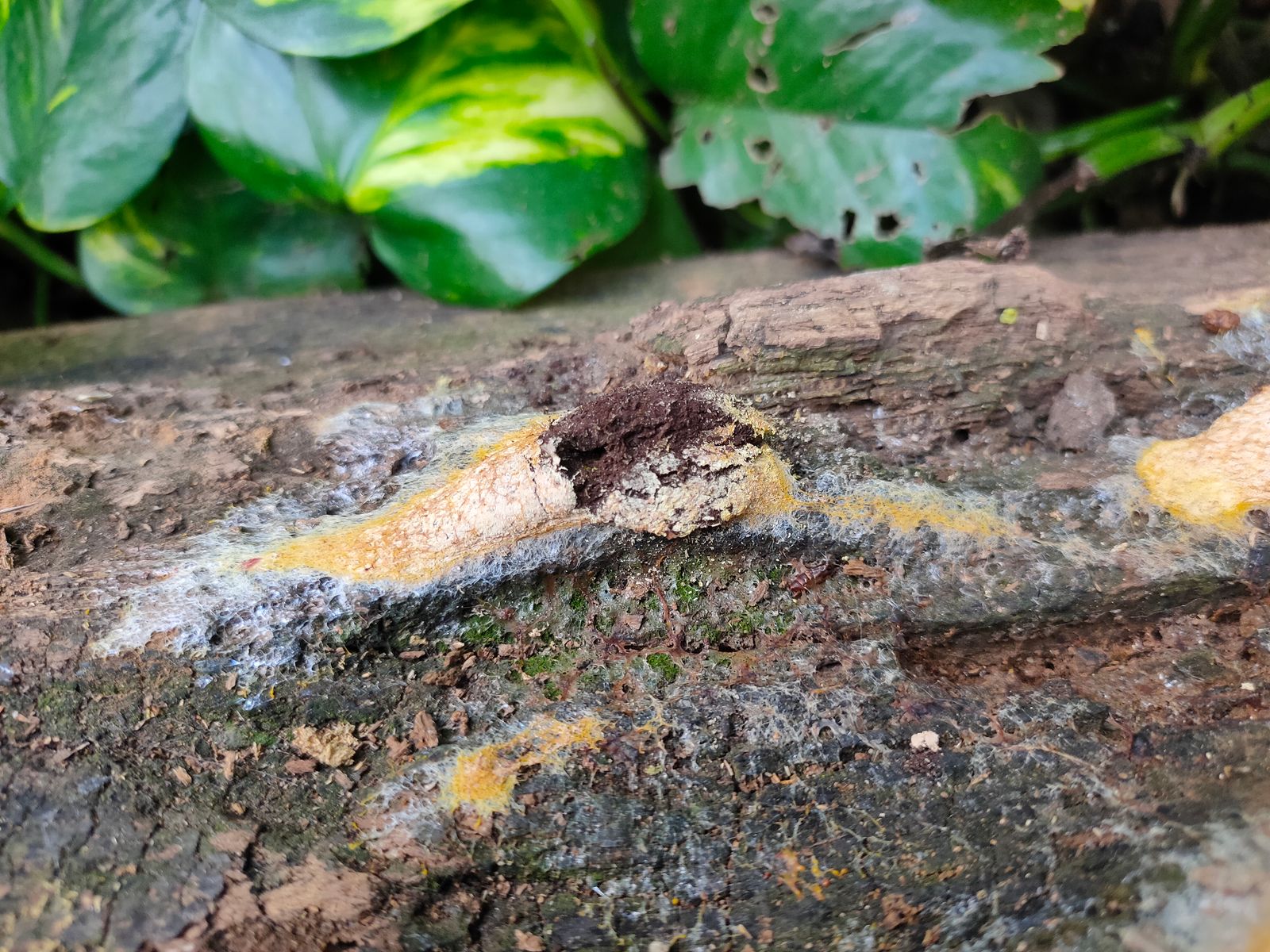 Das letzte ist ein Schleimpilz, das sollte Fuligo rufa sein, allenfalls noch F. leviderma, aber den kenn ich nur anders geformt.