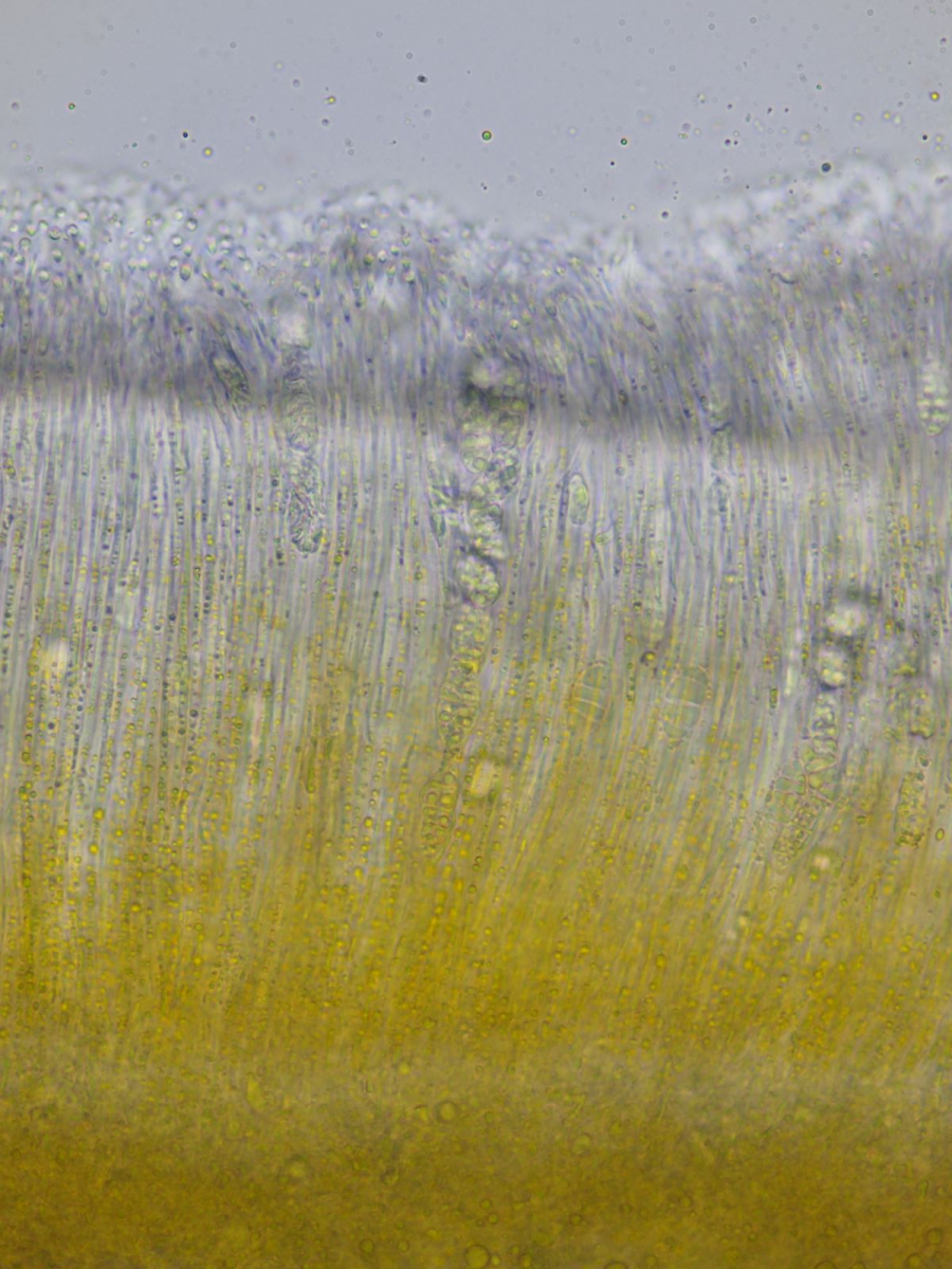 Von der flüssigen Masse habe ich etwas auf einen OT getropft und gewartet bis es beginnt sich wieder zu verfestigen. Dann habe ich mit einer Pinzette das Apothecium aufgesetzt und dann nochmals eine Schicht PEG darüber gegossen. Nach Erkalten (Gefrierfach 5min) begann ich mit dem Schneiden mit einer Rasierklinge. Das schien zunächst passabel zu gelingen, leider löste sich nach dem dritten Schnitt das PEG vom OT ab. Ich hielt es also fortan zwischen Daumen und Zeigefinger und nutzte den Nagel des Letzteren als Führung- das ging fast noch besser als auf dem OT. Das getrocknete Apothecium war allerdings deutlich härter als das PEG (in diesem Fall war ich froh das höhere Molgewicht gewält zu haben), was einen kräftigen Schnitt einem Zug verlangte.