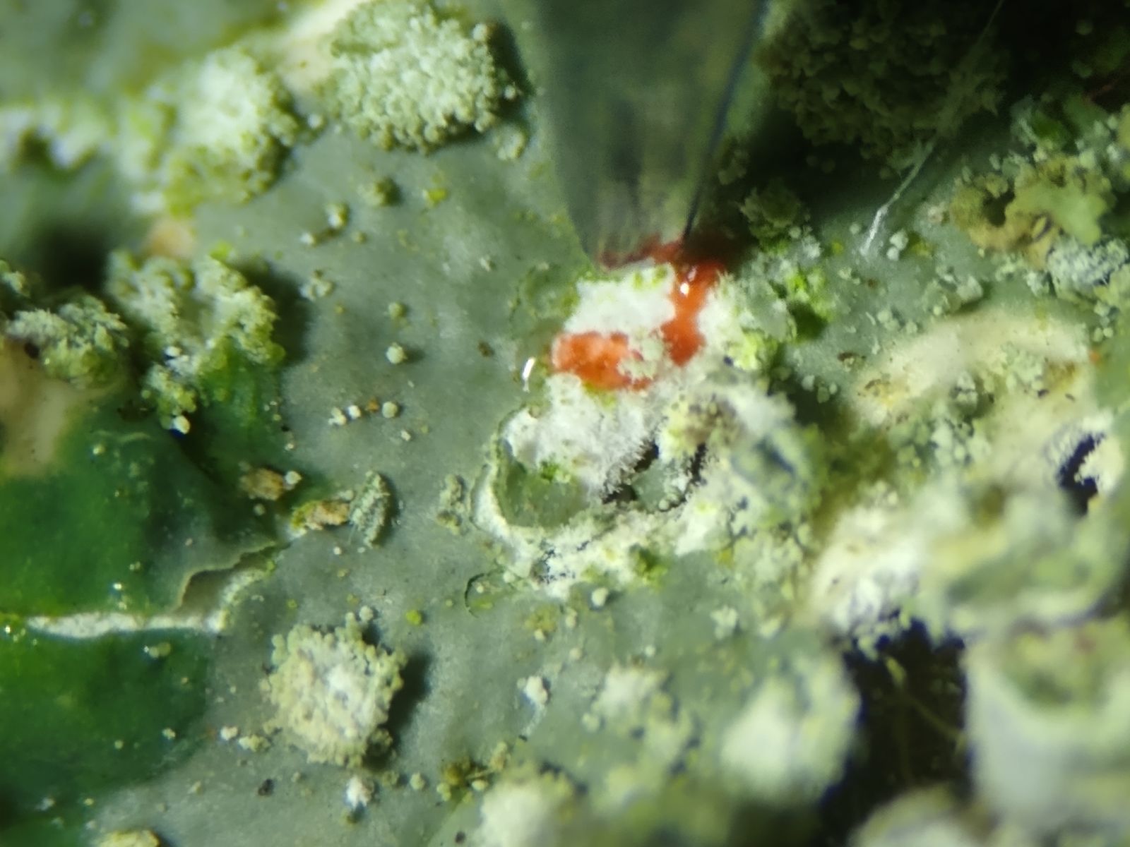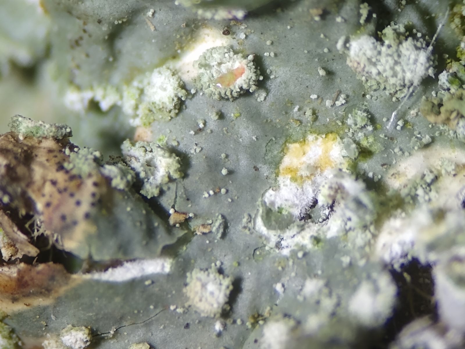 Makroskopisch ist der Befund erstmal unaauffällig - ein weißer, ggf. minimal eingesunken wirkender Fleck zwischen Xanthoria und Physcia sp. mit einem Durchmesser von ~1.5 cm.