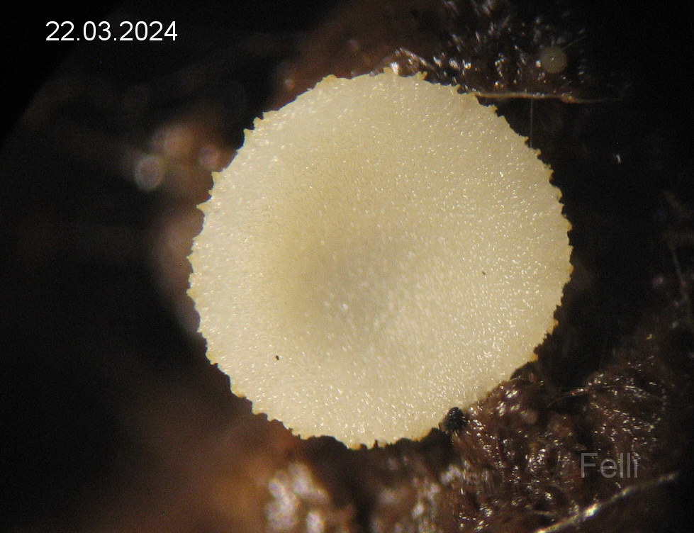 Apothecium erst kugelig dann ausgebreitetet bis 3mm , Basis leicht stielartig zusammengezogen.