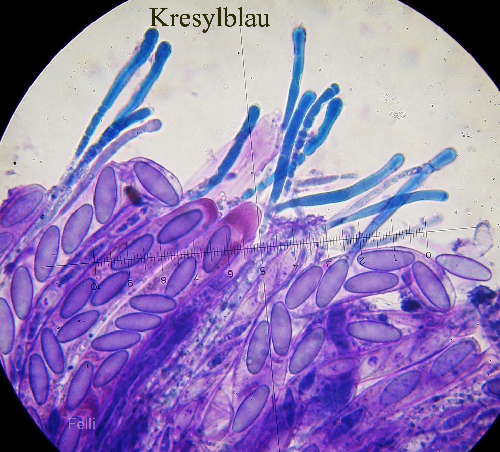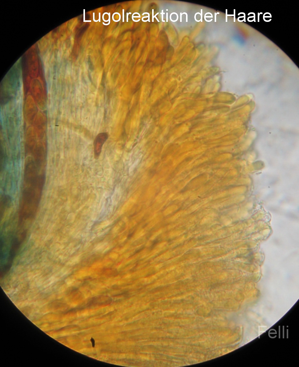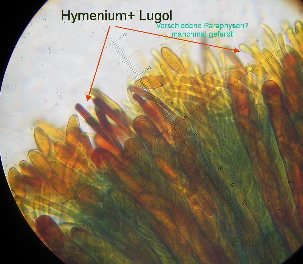 Sporen uni/biseriat, Basis mit Haken / gegabelt; IKI+, ganzes Hymenium blau, einzelne Paraphyseninhalte färben sich rotbraun! Sind es zwei verschiedene Paraphysenarten?