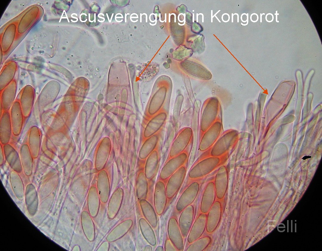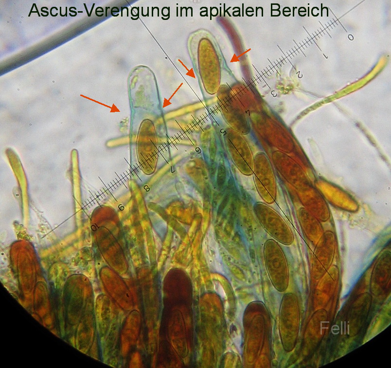 Asci: 170-200 x 12-14µ, zylindrisch, 8- sporig, mit deutlicher subapikalen Verengung,
