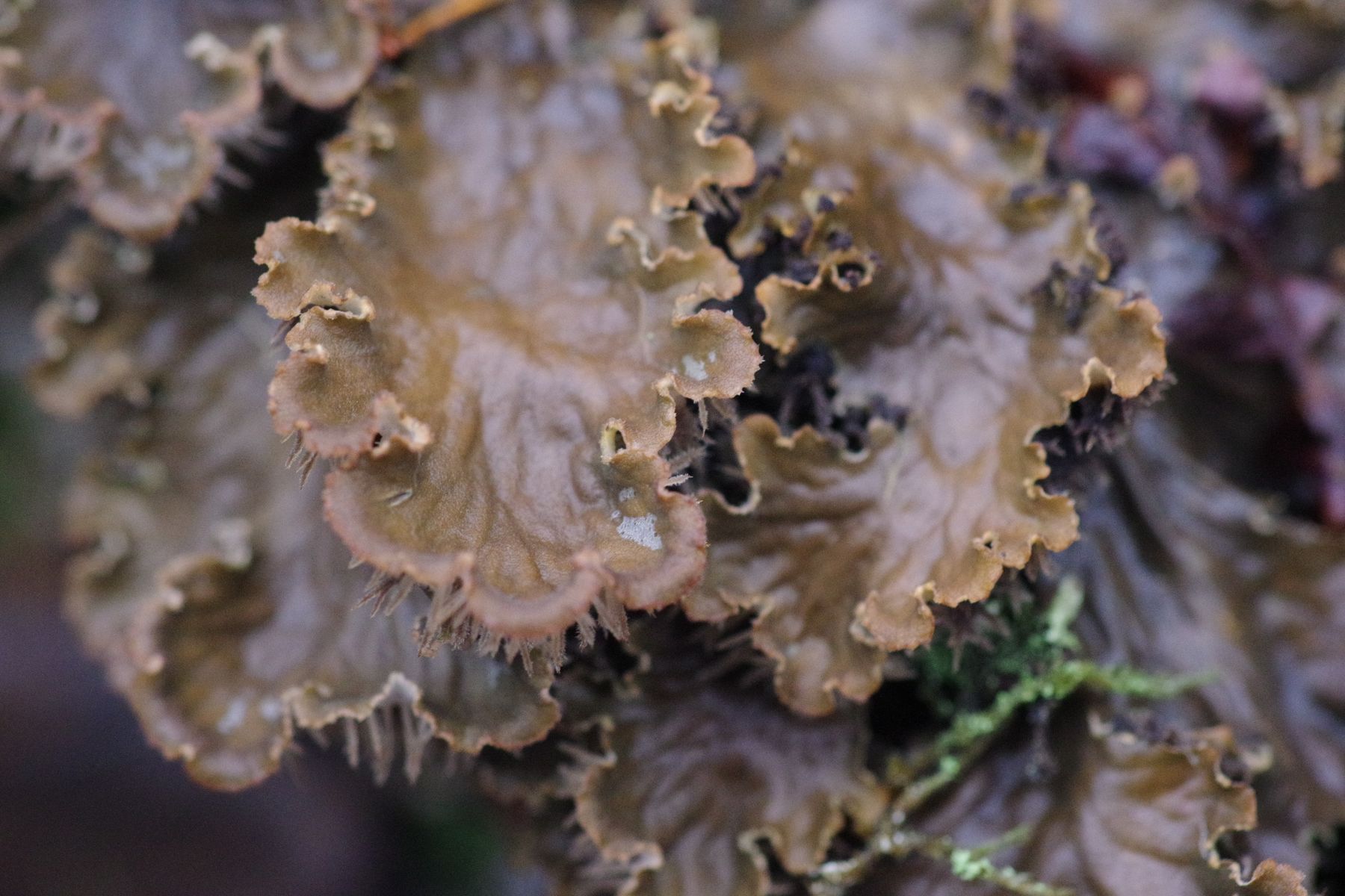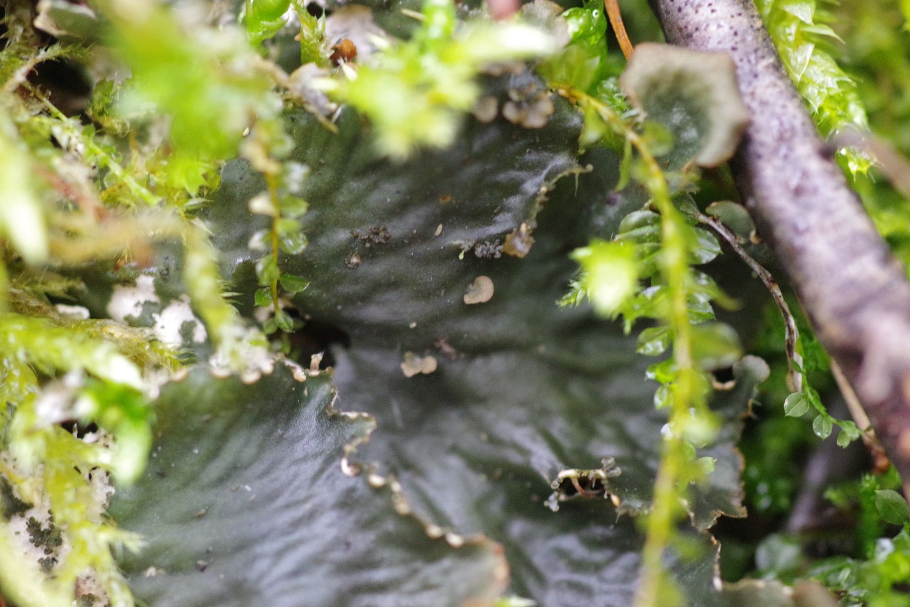 2) Eine Art mit riesigen Lappen und ohne Apothecien, die an P. canina erinnert. Wobei P. canina an sonnigen trockenen Standorten auf dem Boden zwischen Moosen vorkommt - was hier ja nun gar nicht zutreffend ist. Mit den markanten weißen Adern könnte das P. membranacea sein, oder man wirft den Geist P. neocanina (https://dalib.cz/en/taxon/info/Peltigera%20neocanina) in die Runde. An einer Stelle wachsen neue Lappen aus der Lappenoberfläche heraus und es sieht aus, als gäbe es Soredien (o.ä.) an einer Wunde. P. praetextata würde ich trotzdem nicht in Betracht ziehen, die kommt schon anders daher.