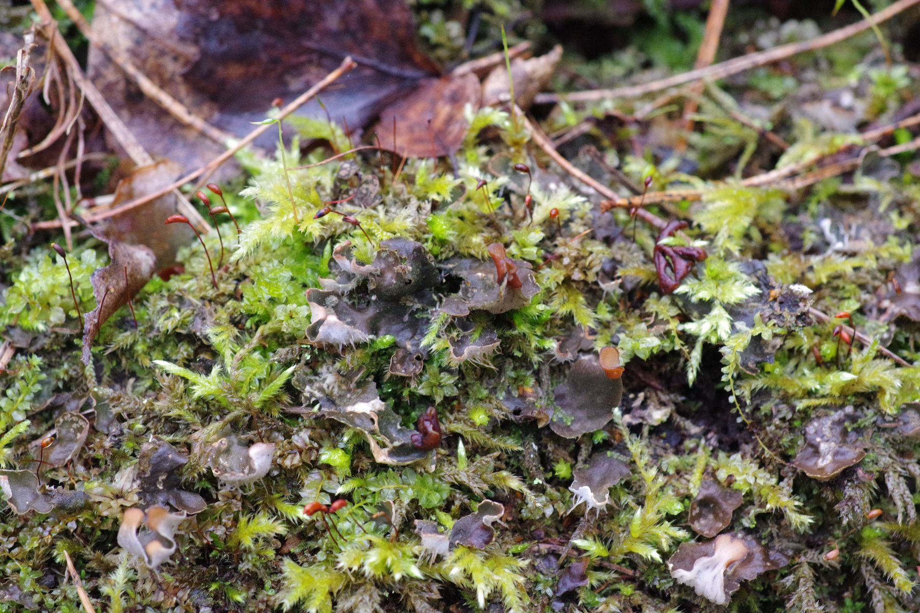 Das ist eine Art Kuhle, wo gelegentlich Wasser stehen mag, zumindest ist es das ganze Jahr über feucht, jetzt ist aber kein Wasser da. Da stehen etliche S. fragilis, die teilweise umfallen und dann neu austreiben. Oder auch nicht. Von den drei Peltigeras sind zwei auch an noch lebenden bemoosten Stämmen daneben zu finden.
