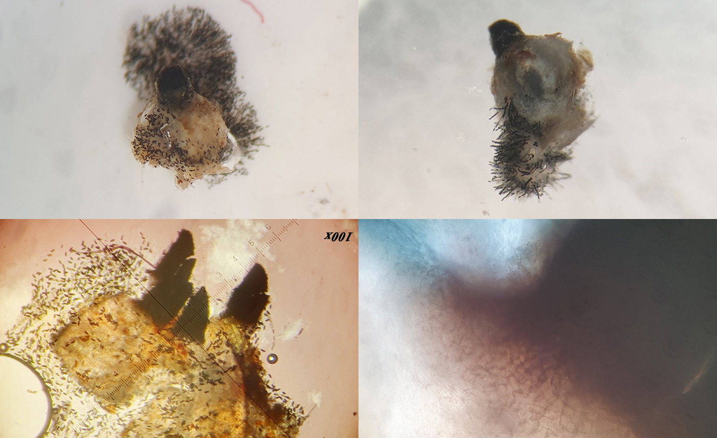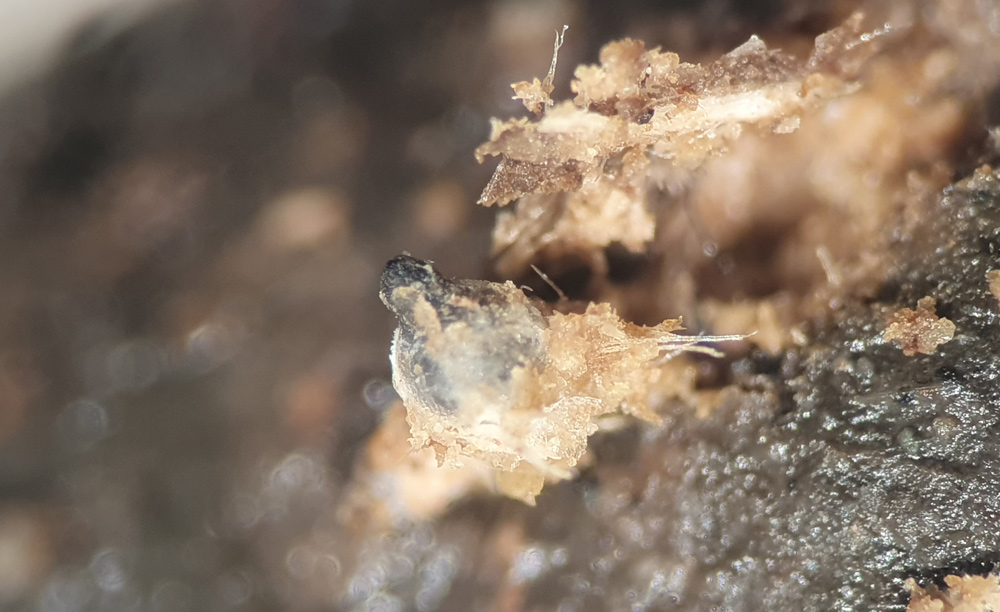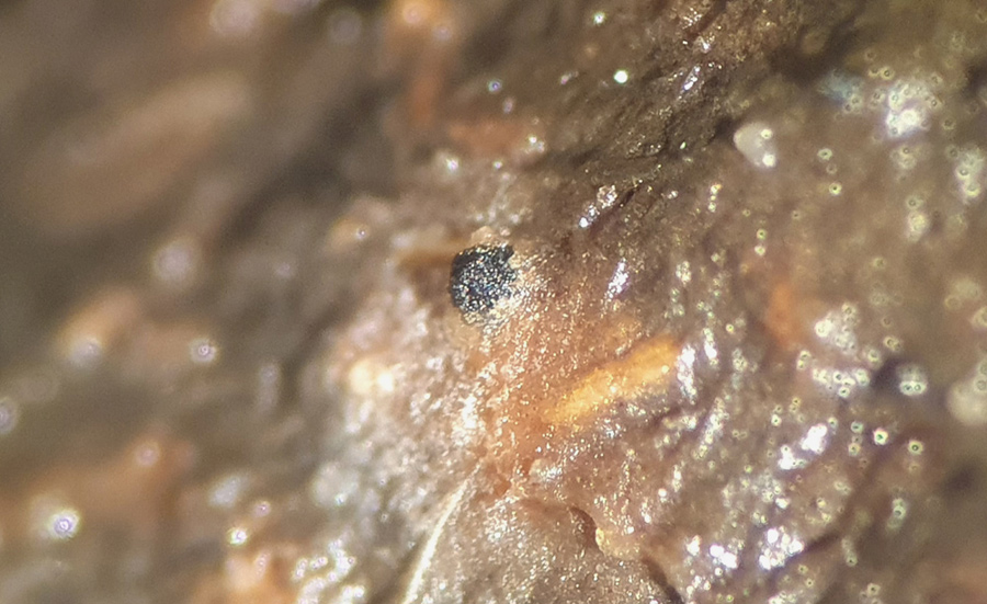 das ausgelöste Perithezium war rundlich, beigefarben und 0,8 x 0,7 µm groß. Die Struktur des Excipulums eine undeutliche textura angularis.
